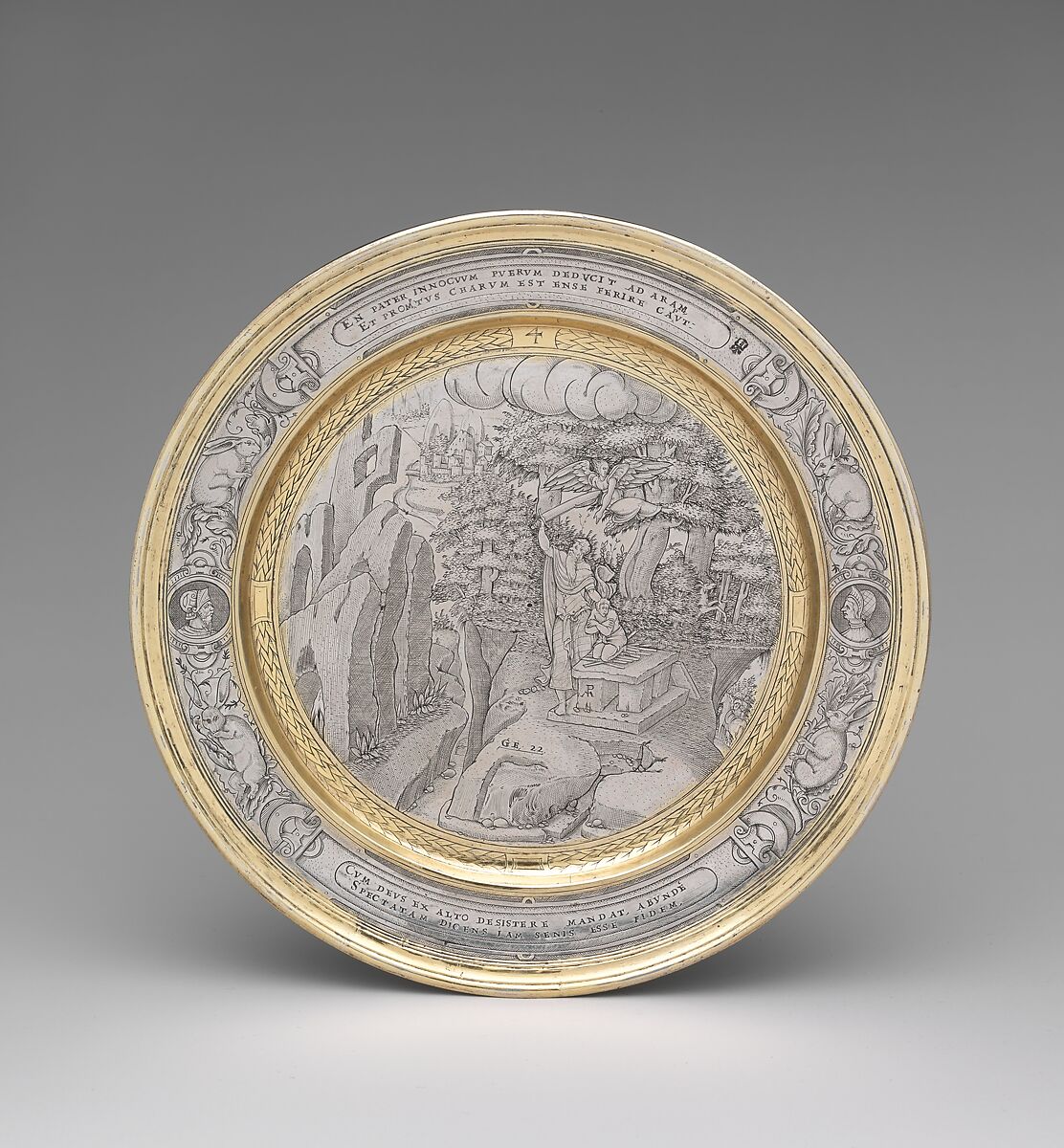 The fine engraving on this set of plates (65.260.1–.12) depicts scenes from the Old Testament. The engraver, who must have been trained on the Continent, based his compositions on illustrations in a Concordance to the Bible, improvising where necessary to fill in the circular frame offered by the plates. The plates and a related piece engraved with a portrait of Queen Elizabeth I must have been made as a gift to or from the queen herself.