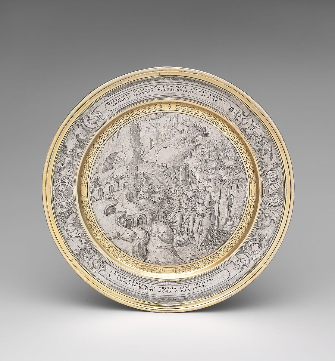 The fine engraving on this set of plates (65.260.1–.12) depicts scenes from the Old Testament. The engraver, who must have been trained on the Continent, based his compositions on illustrations in a Concordance to the Bible, improvising where necessary to fill in the circular frame offered by the plates. The plates and a related piece engraved with a portrait of Queen Elizabeth I must have been made as a gift to or from the queen herself.