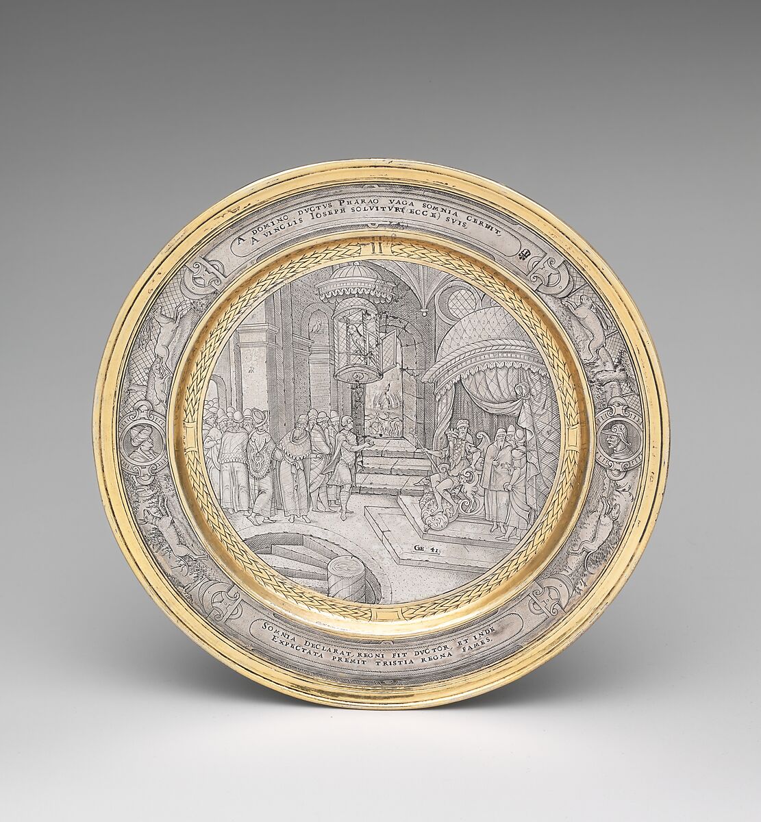 The fine engraving on this set of plates (65.260.1–.12) depicts scenes from the Old Testament. The engraver, who must have been trained on the Continent, based his compositions on illustrations in a Concordance to the Bible, improvising where necessary to fill in the circular frame offered by the plates. The plates and a related piece engraved with a portrait of Queen Elizabeth I must have been made as a gift to or from the queen herself.