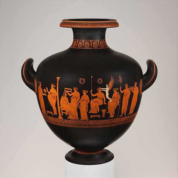 This basalt vase, in the shape of a hydria (minus the black handle), bears acanthus, Greek key and egg-pattern details, and a frieze depicting the toilet of a bride. The bride, near the center, is seated on a raised ground, holds a scepter, and wears an embroidered chiton, mantle, and diadem with rays in front. She looks around at Eros, who flies toward her but is restrained at the knee by a seated woman. A laurel-wreathed youth wearing a himation, possibly Apollo, stands nearby holding a laurel branch. Beyond him is a woman in a long chiton, himation, and fillet around her hair holding a rectangular box decorated in bands. To the right of the bride are three female figures, one seated, another holding a laurel wreath, and a third holding a box. Beyond them, set apart by an Ionic column, a woman in a chiton and mantle gives an unguent box on a stand to another seated figure in a long chiton with a diadem on her head. On the ground are two footstools and a wool basket; above hang two wreaths.