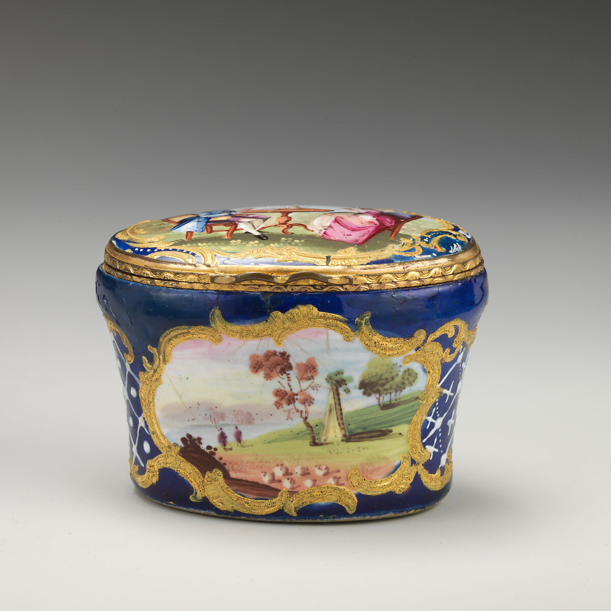 Enameled objects like this one, intended to imitate the lustrous quality of porcelain, were among the more affordable goods sold at toyshops across London and in fashionable English resort towns. Though often called "Battersea enamels" in common parlance (referring to the manufactory at York House, Battersea, operating only between 1753 and 1756), we rarely know exactly where individual pieces were made. The main centers of enamel production were in London, South Staffordshire (particularly in Bilston and Wednesbury), and Birmingham.