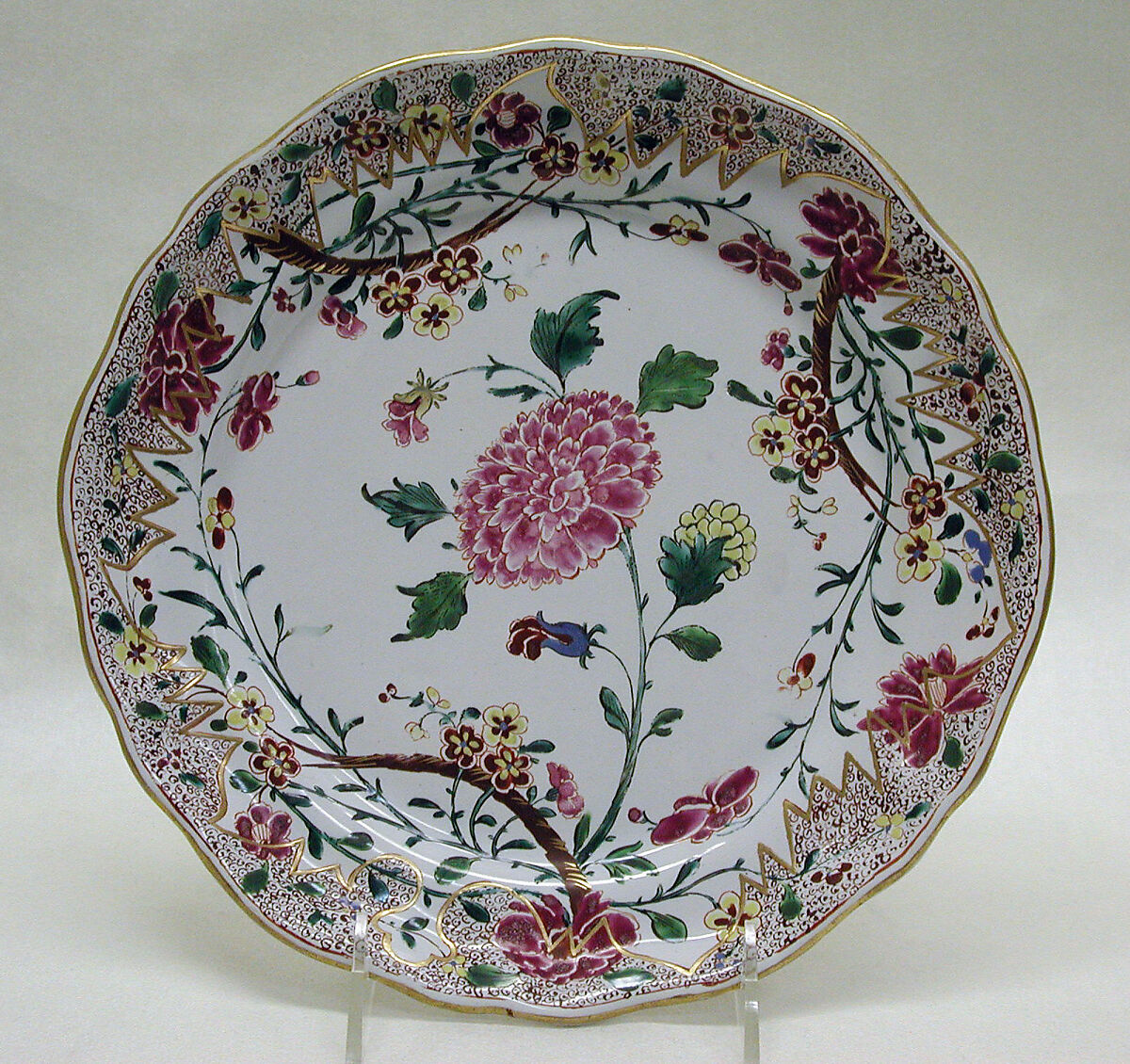A very original use of the Chinese peony and hawthorne flower motifs in brilliant enamels and plentiful gilding.