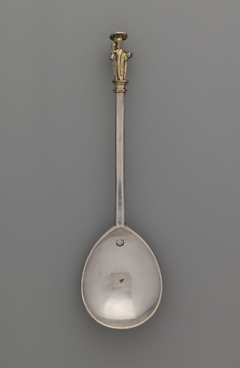 The set (67.166.1–.13) includes a master spoon with a figure of Christ and twelve apostle spoons. Martin Hewitt who made the Saint Andrew spoon had served his apprenticeship under William Cawdell. Both were specialist spoonmakers.