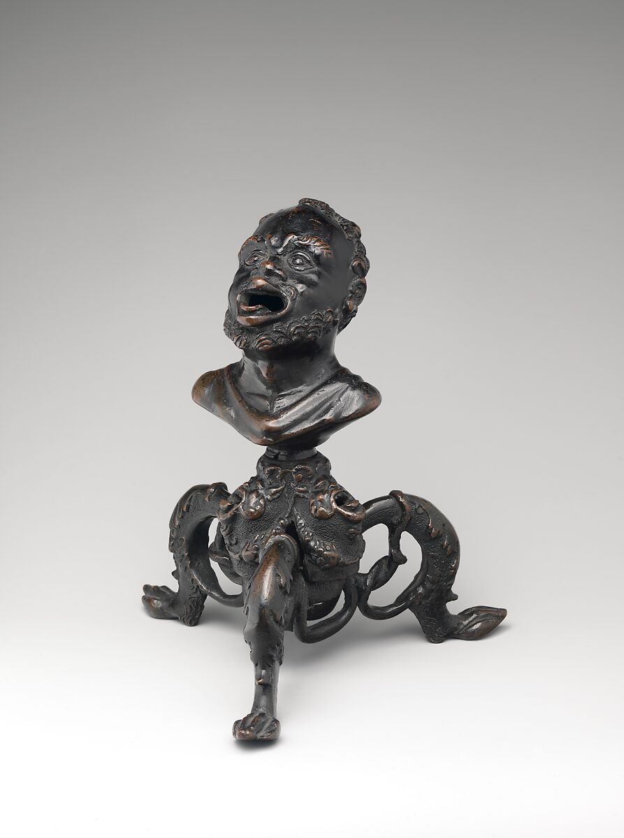 The vessel represents a design widespread during the Renaissance, with numerous extant versions in museums worldwide.[1] It is a particular variant on a wider array of bronze lamps styled on imagery of Black Africans.[2] Such lamps derived from ancient prototypes and relate to a broader history of antique vessels shaped as heads of Black Africans.[3] Renaissance lamps of this type approached their subjects in a dehumanizing fashion, exaggerating facial features and adding horns and foliage, attributes typical of satyrs.[4] Such lamps were rooted in the treatment of race in the Renaissance and speak to the extensive, vile stereotyping of Black Africans during the period.[5] The Veneto, where this bronze was produced, notably achieved wealth through the commerce and ownership of slaves, including from sub-Saharan Africa.[6]