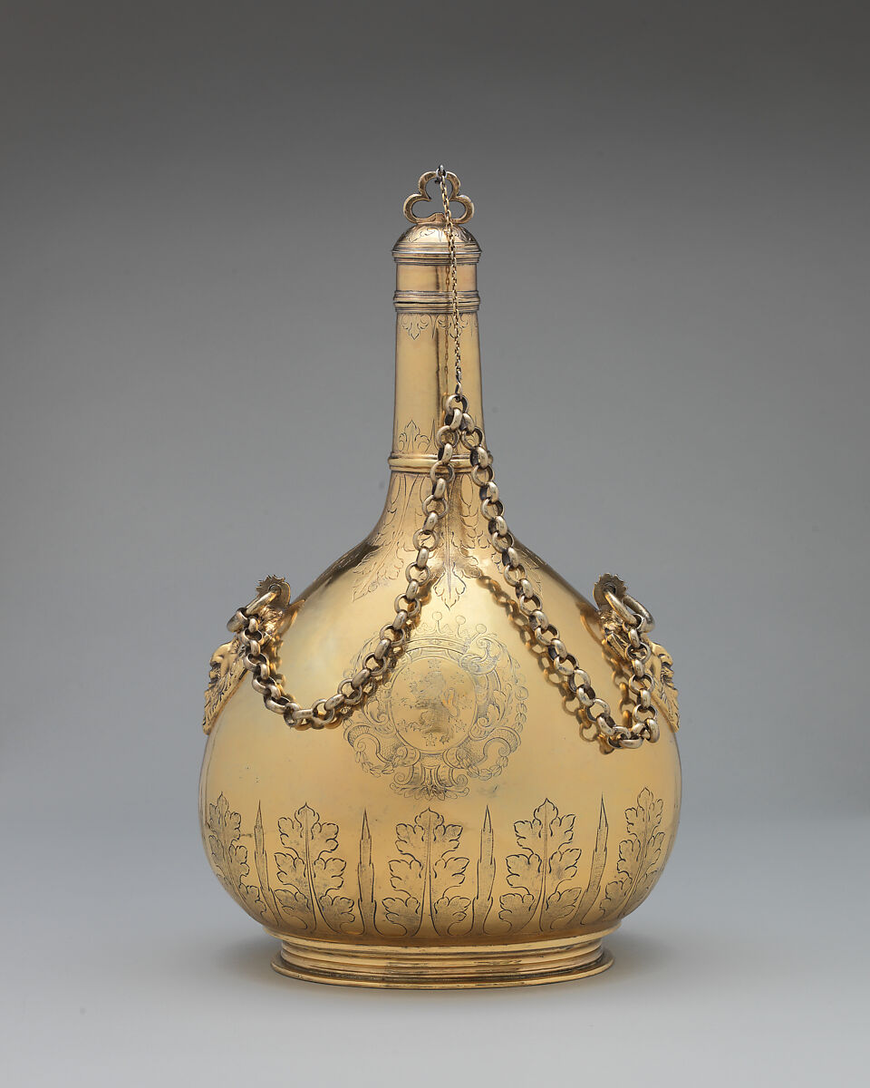 This bottle and its pair (68.141.226) are engraved with the arms and coronet of Evelyn Pierrepont (1665–1726), fifth Earl of Kingston-upon-Hull, later Marquess and Duke of Kingston.