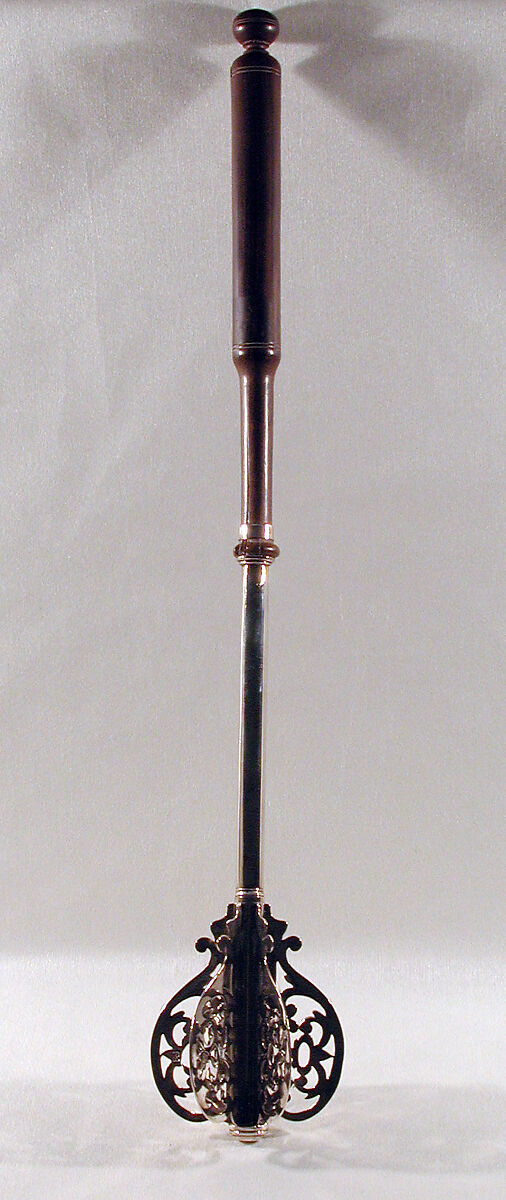 This piece is unusual, as the stirrers for chocolate pots were usually wood. The wooden handle extension is modern. The twirler called a molinillo, was invented in Spain in the sixteenth century.