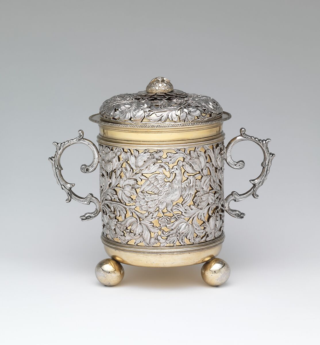 The taste for such luxuriant pierced silver cups, lined with a gilt sleeve, had its origins in Germany and the Baltic countries, and was short-lived in England. Many of the surviving cups, made by foreigners who worked "under the table," are unmarked. The delicate naturalism of this cup is the work of a highly trained chaser.