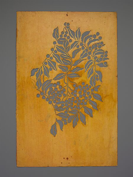Hornblower probably created and used this stencil design of soapberry tree branches during her tenure as a textile designer at Tiffany Studios. Like Tiffany and other designers at his firm, she was drawn to nature for inspiration in her work, creating motifs with identifiable plants and flowers. This stencil, which was produced using a transferred or traced design, was coated with a varnish-like substance. Paper stencils were often waxed, oiled, or covered with a resin in order to strengthen the paper and repel dyes and pigments during use. Small punctures are evident along the perimeter of the stencil, likely resulting from pins used to fasten the stencil onto the fabric before dyes or pigments were applied to print the pattern. Metallic pigments remain on the stencil from past use.
