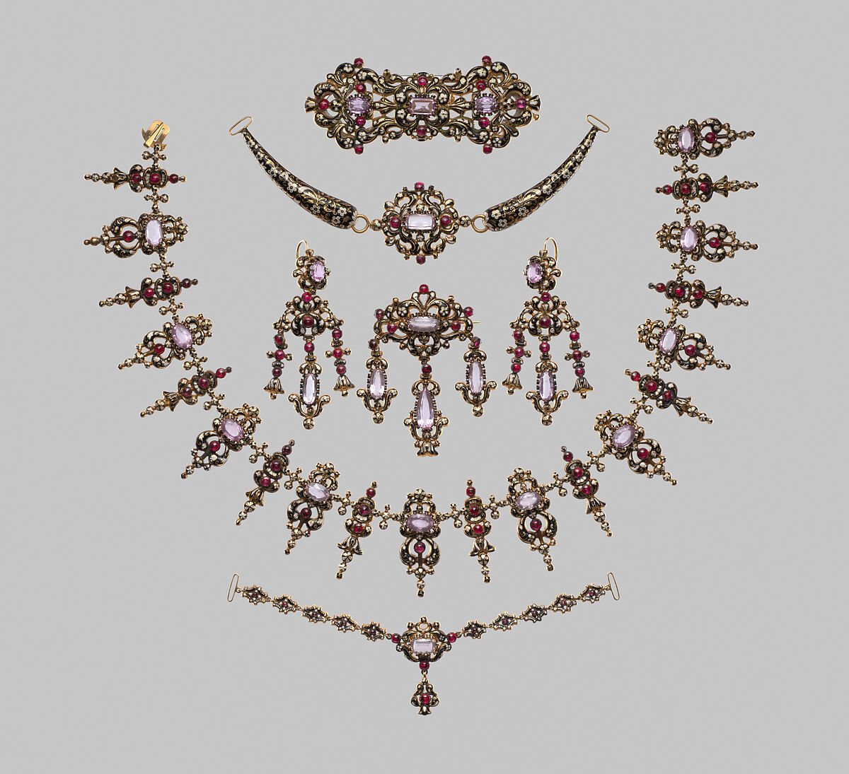 - Dimensions: Length (necklace [.1]): 16 1/2 in. (41.9 cm); Length (choker [.2]): 6 1/4 in. (15.9 cm); Brooch [.3]: 2 3/4 × 2 1/8 in. (7 × 5.4 cm); Height (earrings [.4], each, without loop): 2 3/4 in. (7 cm); Length (buckle [.5]): 3 3/4 in. (9.5 cm); Width (choker ornament [.6a]): 1 5/8 in. (4.1 cm); Length (choker attachments [.6b, c]): 2 in. (5.1 cm)