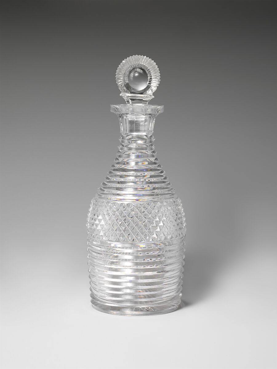 William Bayard (1761–1826) commissioned this table service (2008.594.1-.53) in 1818 for his daughter Harriet (1799–1875) and her husband Stephen Van Rensselaer IV (1789–1868) from Pellatt & Green, London’s premier glasshouse. The fine lead glass and deep Regency cutting would have created a brilliant sparkle in their candlelit dining room, in Albany, New York. The set originally included dozens of drinking glasses, for claret, ale, and champagne, as well as decanters, wine coolers, tumblers, and finger glasses, all “elegantly cut in diamonds & Rings” according to the surviving bill of sale (2008.594.54a,b). In addition to its elegance and quality, the service is extremely rare in it’s documentation to the specific American family who owned it and to the English glasshouse that made it.