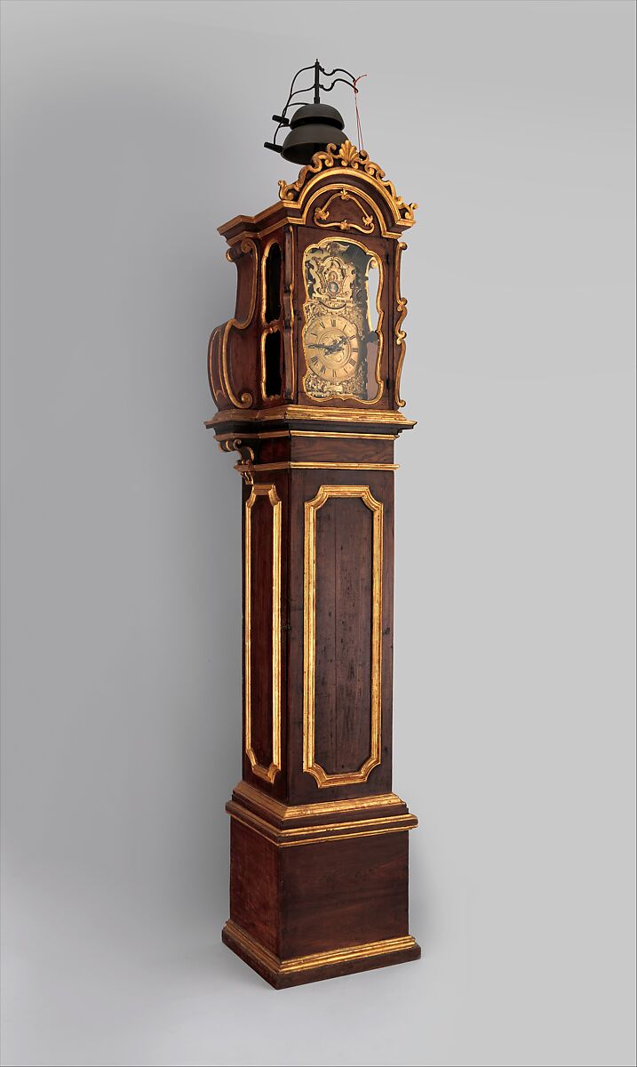 - Medium: Case: partly gilded walnut and pine with later additions of various woods; Dial: brass; Movement: brass and steel