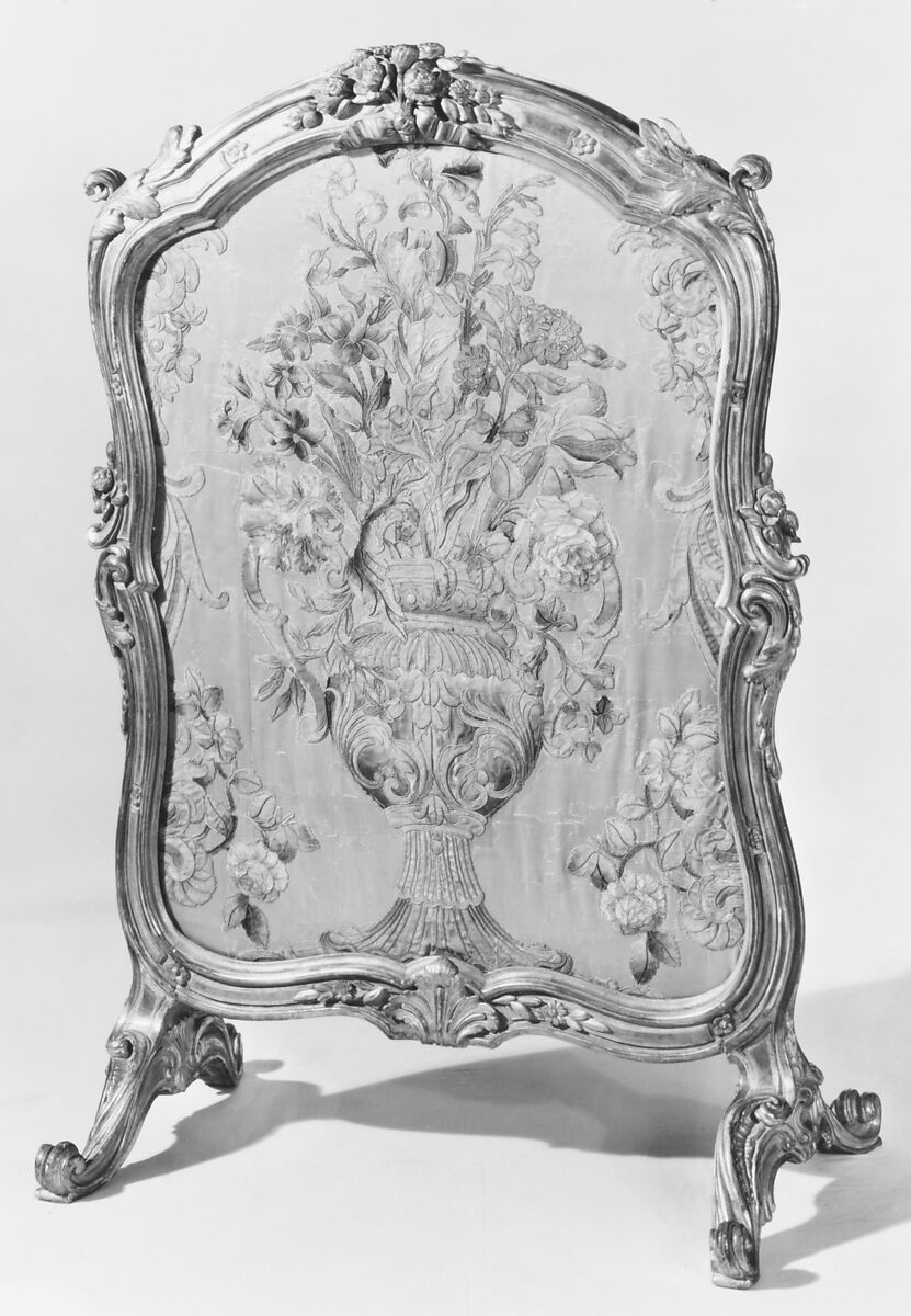 During the Middle-Ages and the Renaissance, screens were put in front of fireplace as protection against the heat. Initially in wicker, more luxurious materials were used during the modern age when such screens became part of a room decoration. This fire screen is made of carved and gilded beech wood. Its serpentine outline, moldings, scrolls and floral motifs are symptomatic of the rocaille style used during Louis XV’s reign.