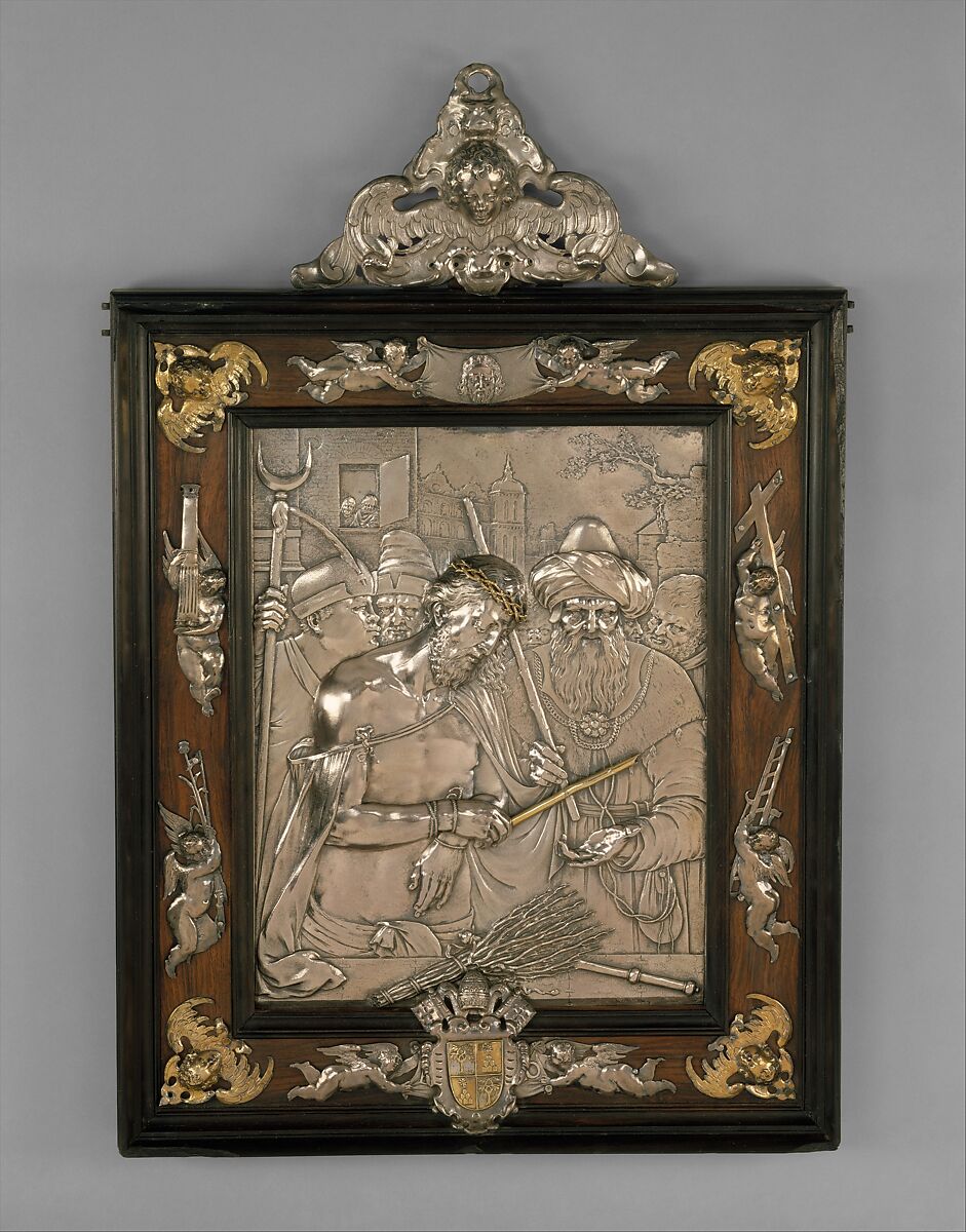 This scene may have an as yet undiscovered engraved scene. Full of picturesque touches such as are met with in the work of Lucas van Leyden, the relief has a different spirit from the decorative reliefs on the frame, which are in the lobate style of the Utrecht goldsmith Paulus van Vianen and his followers. The arms of Pope Alexander VII at the bottom were added later. A letter in a seventeenth-century hand, affixed to the back, states that Alexander conferred an indulgence on the relief.
