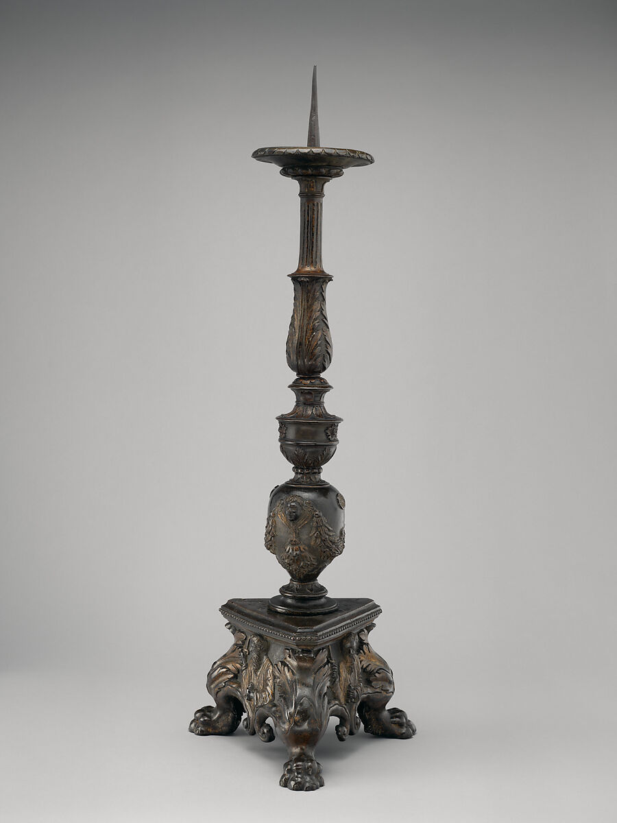 The Roman Rite stipulates that candles be lit on or behind the altar during the celebration of Mass, flanking a crucifix. The humble beeswax of the candles symbolizes Christ’s body, the wick his soul, and the flame his divinity. Up to six can be lit, always at Sunday Mass, and a seventh can be used by a bishop celebrating in his own diocese.[2] In the course of the Renaissance, candleholders grew in richness, their stems, knobs for handling, drip pans, and prickets offering a host of design options. (The prickets in all six candles discussed here are modern additions.) Our pair would have stood at the ends of the altar if aligned horizontally with the others, unless the altar was stepped, in which case they would have been placed somewhat lower than the rest.