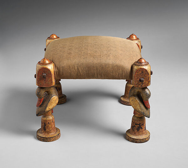 This rare stool is an excellent example of the marriage of Eastern technique and decoration with a form native to the West and intended for the Western marketplace. The stool’s legs are like those of Indian "charpoys" (four-footed beds). When in Kashmir, de Forest saw carved charpoy legs in the shape of ducks, which inspired him to have copies made and painted in the Kashimiri tradition, using gold leaf and overlaid floral patterns. At least two stools with these legs survived. Both have descended through the de Forest family.