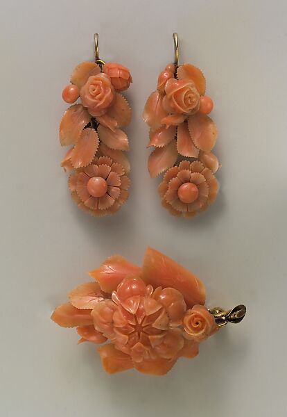 Coral was believed by classical civilizations to possess therapeutic and apotropaic powers, and it has been used as ornament since ancient times. It remained a staple of jewelry design in Victorian America. Coral is an organic gem, the skeleton of tiny marine animals called polyps. During the mid-nineteenth century, when this demi-parure was fabricated, coral was mainly harvested from the Mediterranean waters surrounding Naples. Coral is durable yet soft enough to be carved easily, and it was well-suited for the intricate, naturalistic floral jewelry made popular by the nineteenth-century Rococo revival.