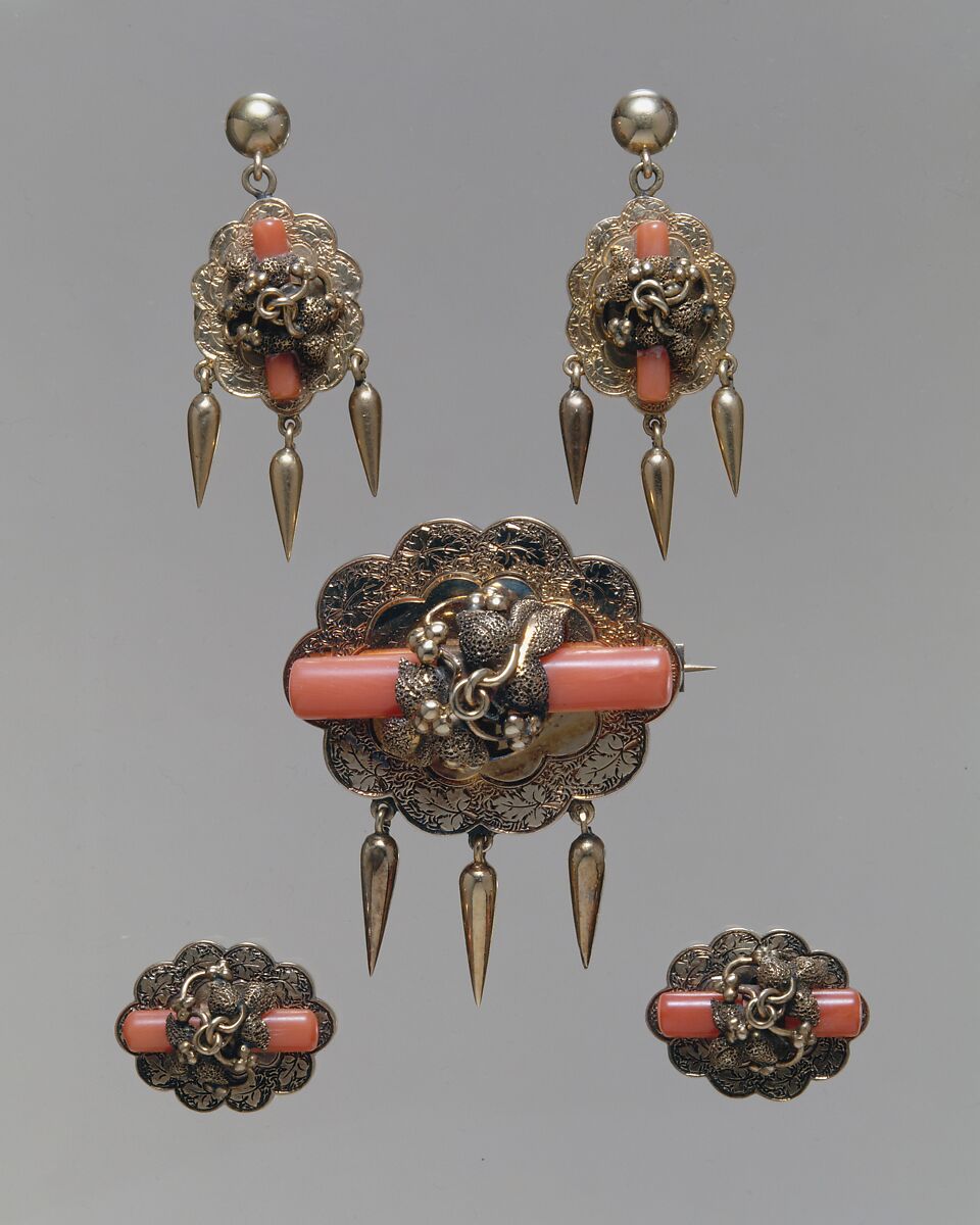 Believed by classical civilizations to possess therapeutic and apotropaic powers and used as ornament since ancient times, coral was a staple of jewelry design in Victorian America. Coral is an organic gem, the skeleton of tiny marine animals called 'polyps.' During the mid-nineteenth century, when this demi-parure was fabricated, coral was mainly harvested from the Mediterranean waters surrounding Naples. American jewelers like Ball, Black & Co. imported Neapolitan coral and set the gems in mountings of their own design. The articulated, pointed pendants suspended from the brooch and earrings speak to the mid-nineteenth century trend of 'archaeological' style jewelry. [1]