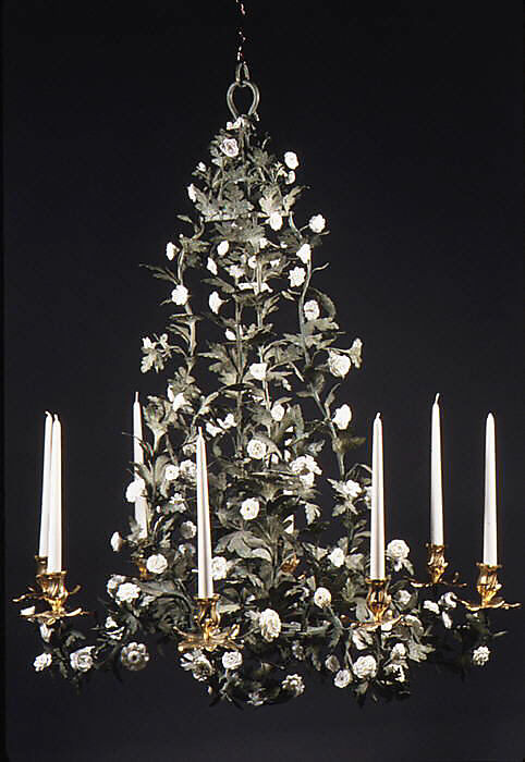 This chandelier is documented as having been in the audience chamber at Schloss Seehof, which was furnished in 1767–68 for Prince Bishop Adam Friedrich von Seinsheim (1708–1779) with "Parisier" seat furniture executed locally in the French fashion. The porcelain flowers, some of which are missing, were probably purchased in France at this time.