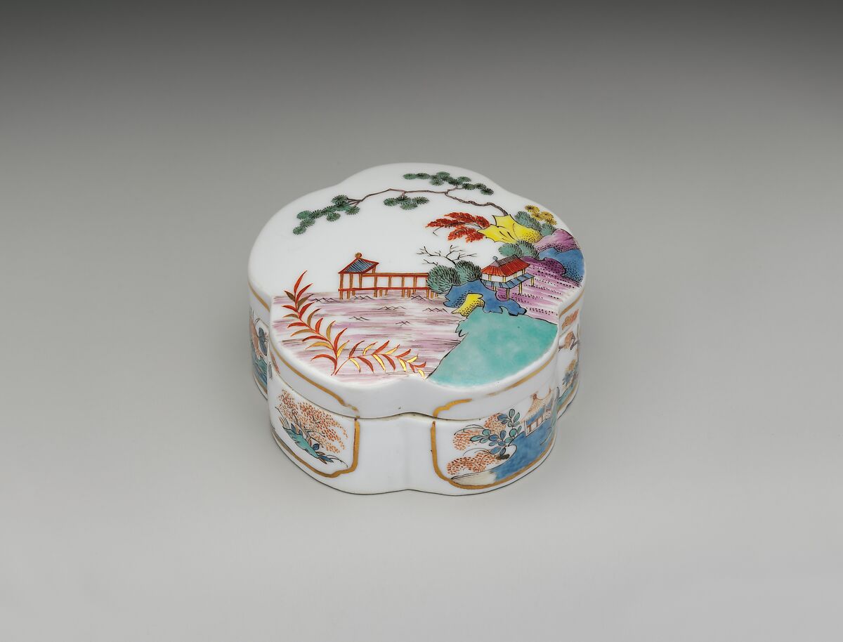 Probably once part of a toilet service, this five-lobed box is based on a Japanese lacquer prototype and may have been placed on a matching stand.