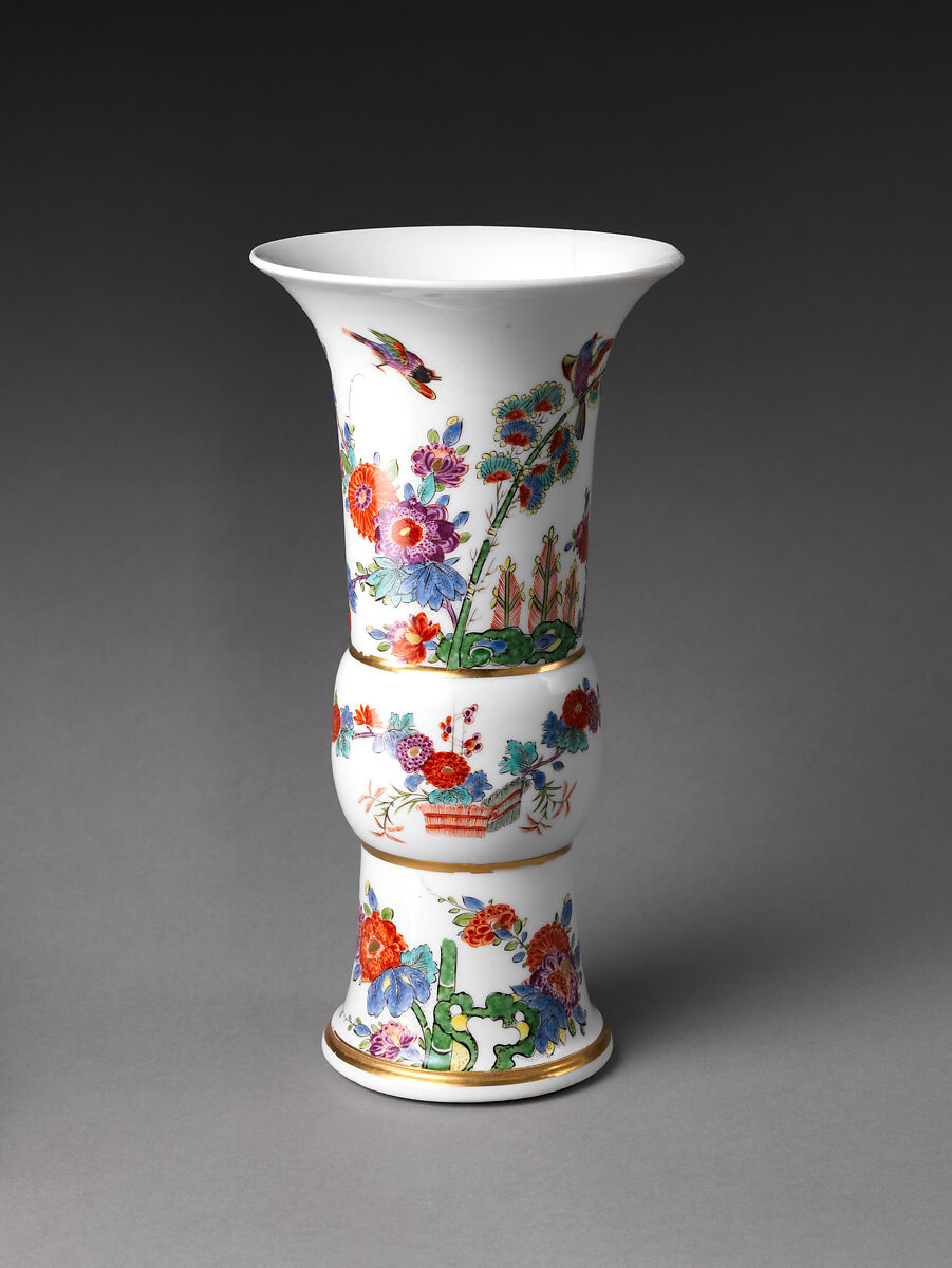 The form of this vase is Chinese in origin, but the decoration freely combines Chinese and Japanese motifs. The vases can be dated to 1733, the only year in which the mark on the base was in use.