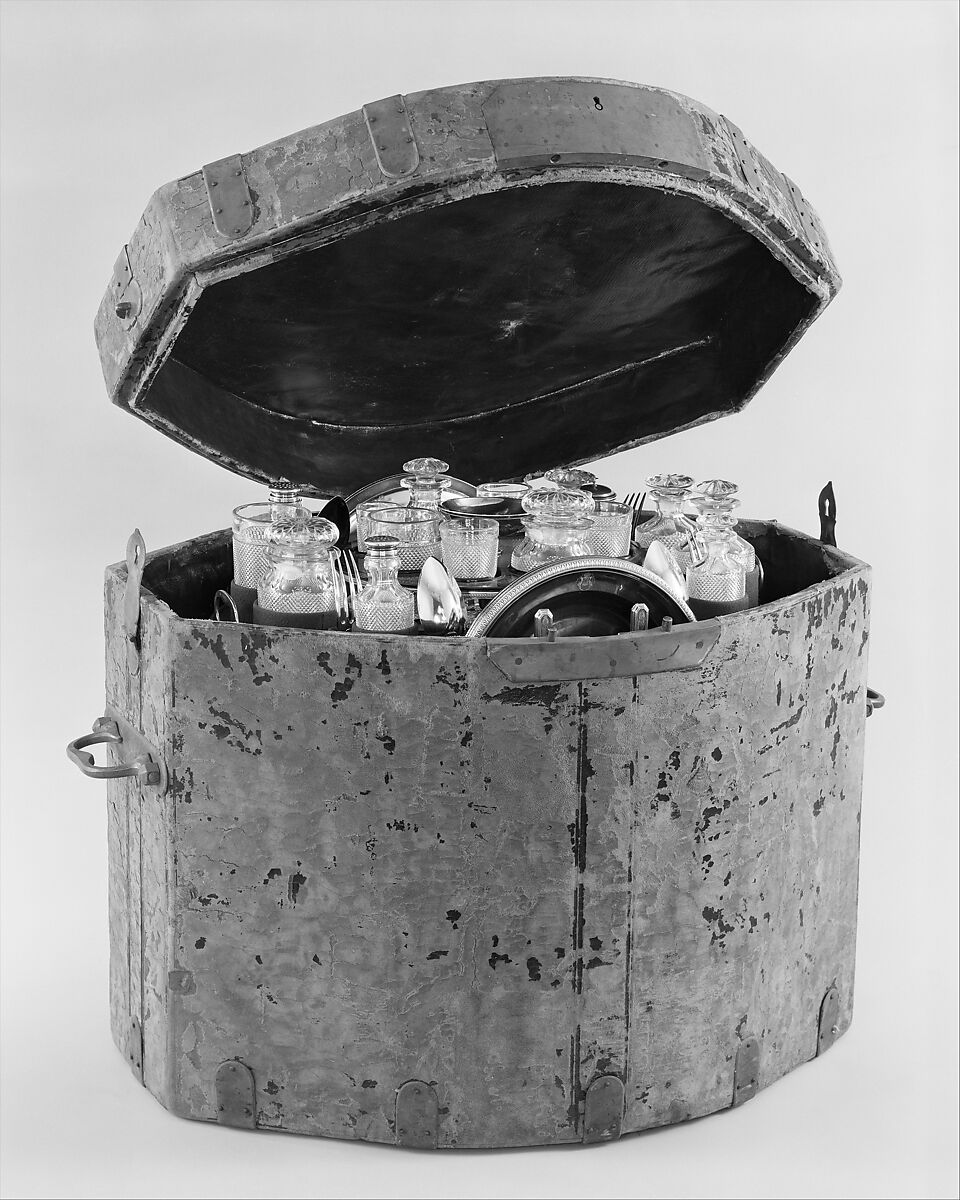 Each piece is engraved with the arms of Napoleon I. Biennais, the imperial goldsmith, specialized in the production of ingeniously designed combinations of cabinetry and goldsmith’s work. The flatware is by Lorillon.