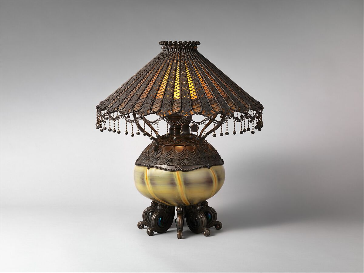 This lamp is among the earliest produced by Tiffany studios, made before Tiffany embarked on the predominantly floral leaded-glass lampshades for which the firm is known. Especially unusual is the use of blown Favrile glass for the oil font, as he had only begun experimenting with blown glass a few years earlier. Typical of his inventiveness, the lamp combines materials and exotic patterns (the bronze collar includes an Islamic-inspired design) to produce an object of exquisite richness. The paisley-shape glaze jewels that ornament the scroll feet are elements found in the decorative program Tiffany executed for Louisine and Henry O. Havemeyer’s house in the early 1890s.