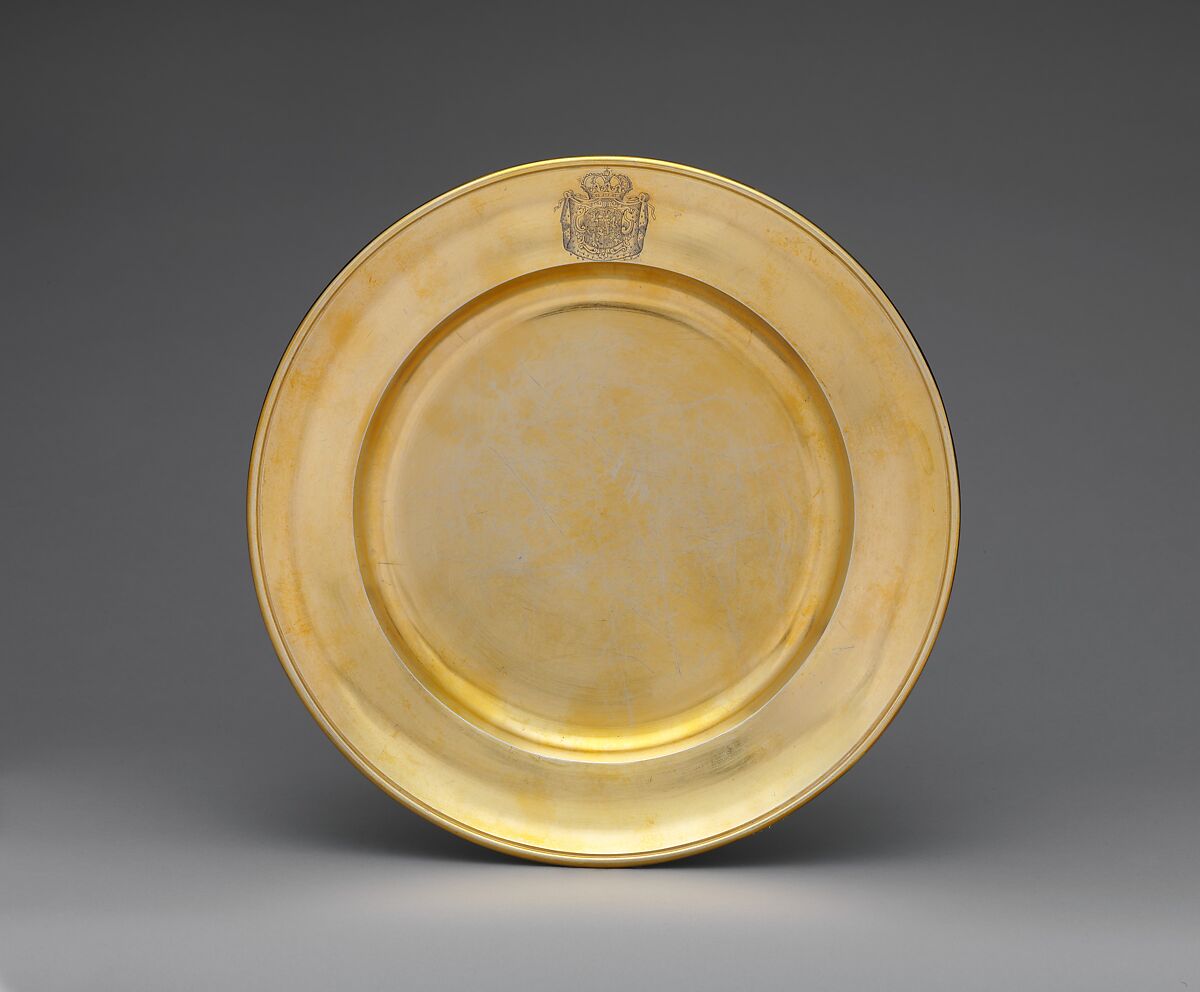 These plates are part of the addition to the Double-Gilded Service of about 1718. The number 224 incised on the reverse indicates the extent of this first grand German parade service, made for Albert’s grandfather Augustus II the Strong (1670–1733), king of Poland (1697–1704, 1709–33) and elector of Saxony (1694–1733; hence the engraved arms). The king is best remembered as a patron of the arts and architecture, commissioning the Zwinger Palace and the fabled Green Vault filled with jeweled treasures as well as separate chambers displaying silver and gilded-silver parade buffets. Augustus commissioned the so-called Double-Gilded (intended to imitate gold) Service from Augsburg, a center of European goldsmithing, on the occasion of the four-week-long festivities surrounding the wedding of Albert’s parents in August 1719.