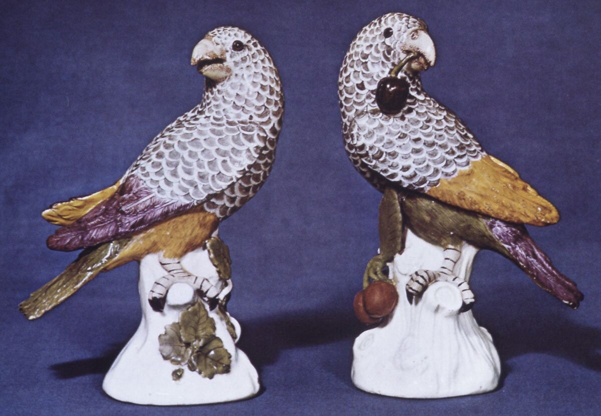 Porcelain birds have their origins in the princely tradition of maintaining collections of living animals and birds in menageries and aviaries, which were viewed as microcosms of the universe, and emblems of royal power and enlightenment. These collections often included exotic birds such as parrots, admired for their rarity, as well as more familiar native species.