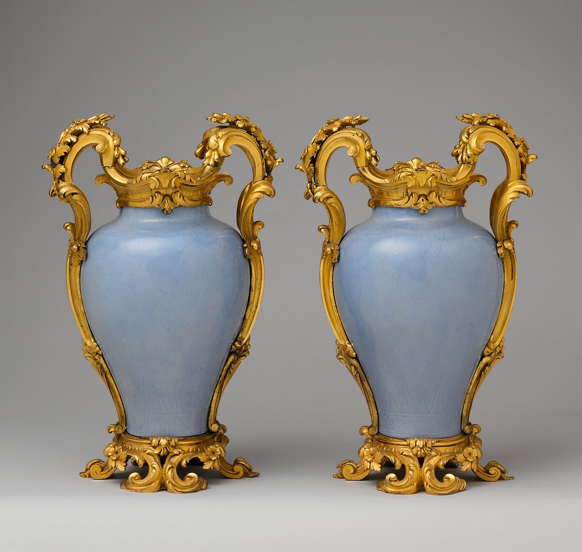 These sky-blue vases of the Ch’ien Lung period were embellished in Paris with scrolled and foliated mounts that were used as bases, handles and rims and adapted them to the European Rococo aesthetic. The mounting of both Asian and European porcelain became a standard and lucrative practice for the Parisian marchands merciers. In this manner they could enhance a mediocre piece of porcelain or preserve a precious but damaged object. These “makers of nothing and sellers of everything” also invented new models for porcelain by giving them pierced mounts and turning them into incense burners or pot pourri holders.