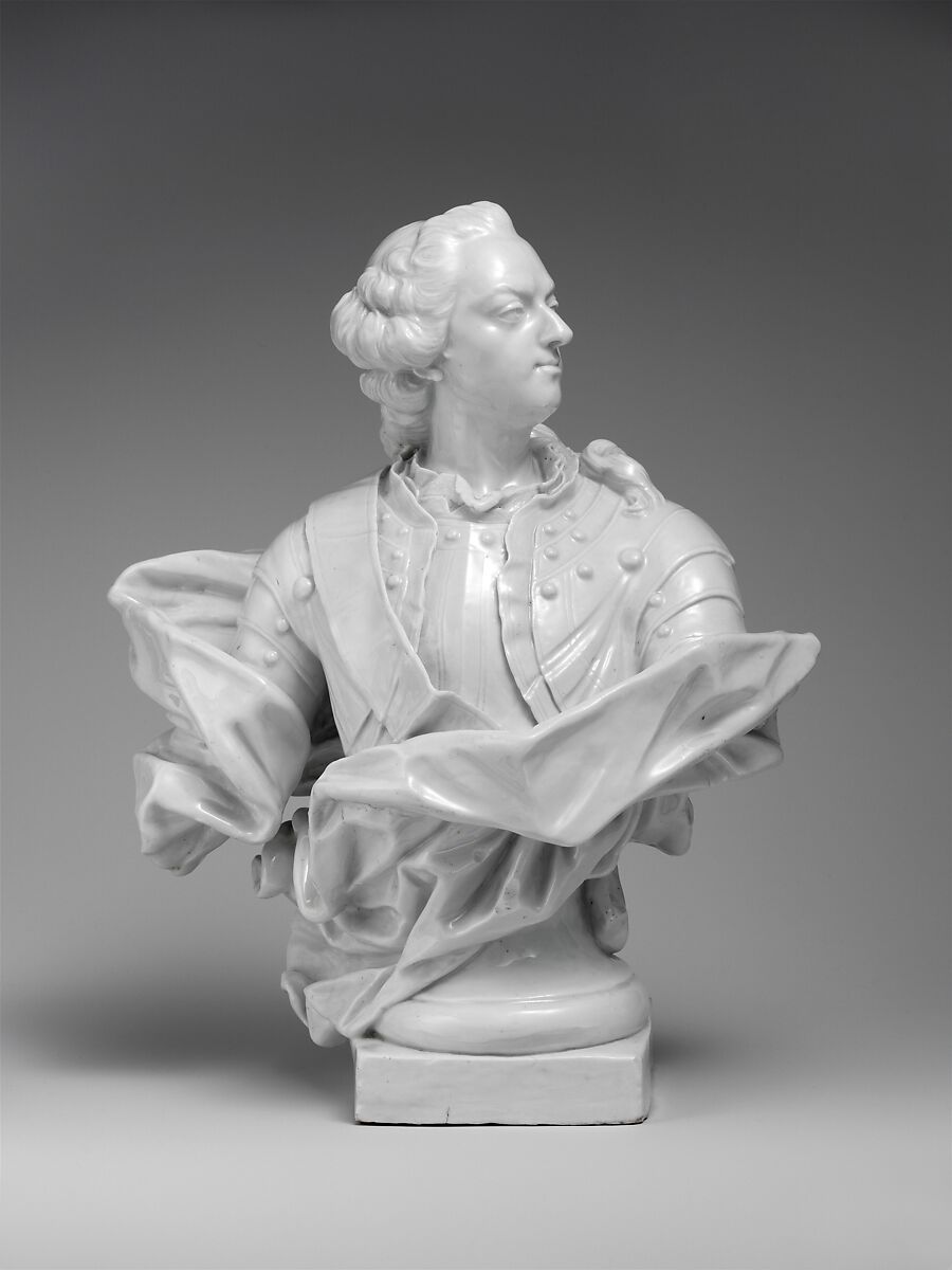 It is highly likely that the model for the Tournai busts is derived from a lifesize marble bust of Louis XV by the French sculptor Jean-Baptiste Lemoyne the Younger (French, 1704–1778). In 1730 Lemoyne inherited from his father the commission for an equestrian monument to honor the French king, and he soon became the monarch’s favorite portraitist, producing an extensive series of busts from the early 1730s through Louis XV’s death in 1774.[5] While the Museum’s bust corresponds in format and style to several of Lemoyne’s portraits of the king, it is not a reduced version of any surviving marble or bronze bust. The Tournai bust bears similarities to Lemoyne’s marble portrait of Louis XV from 1757, which is now in the Museum,[6] but the Lemoyne marble differs in several specific aspects, and it appears to portray an older sitter whose face has filled out with the passage of time. It may be that the modeler at Tournai had access to a print of an earlier bust of Louis XV by Lemoyne, and while the porcelain bust was produced in the second half of the 1750s, it depicts the king at a younger age. The portrait of the king in the Tournai bust has more affinity with Lemoyne’s marble bust of Louis XV of 1749[7] than with his later bust, despite its being almost contemporaneous in date.
