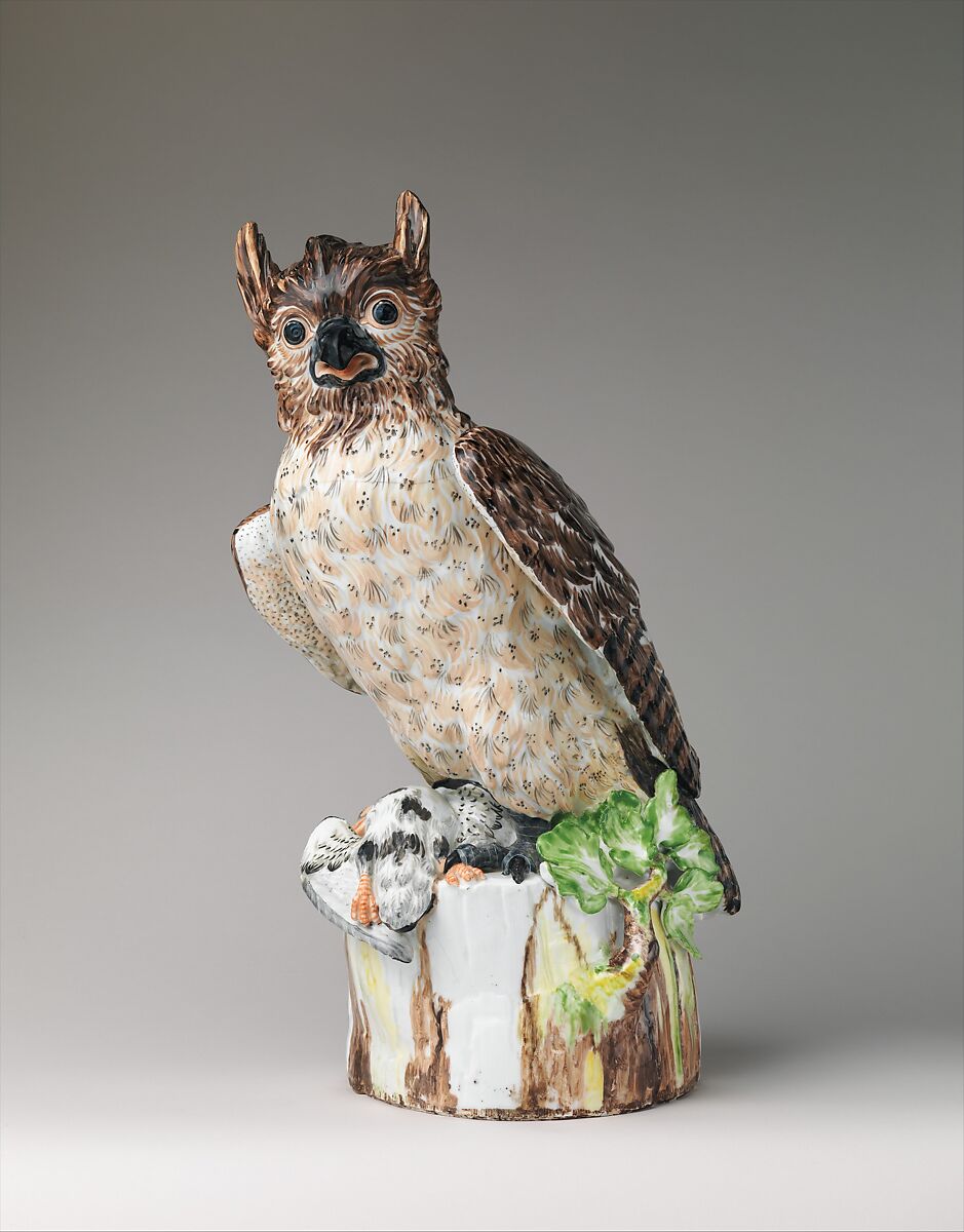 This figure of an eagle owl belongs to a large group of porcelain mammals and birds ordered for one of the Saxon royal palaces in Dresden, Germany. Known as the Japanese Palace, the building was intended to house the vast porcelain collection of Augustus II (1670–1733), the elector of Saxony and King of Poland. Augustus was a voracious collector of both Chinese and Japanese porcelains in the early eighteenth century, and his interest in Asian ceramics led to his establishment of the Meissen factory near Dresden in 1710. The early production at Meissen was strongly influenced by Augustus’s Chinese and Japanese porcelains, and the designs for the interiors of the Japanese Palace incorporated both Asian and Meissen examples.