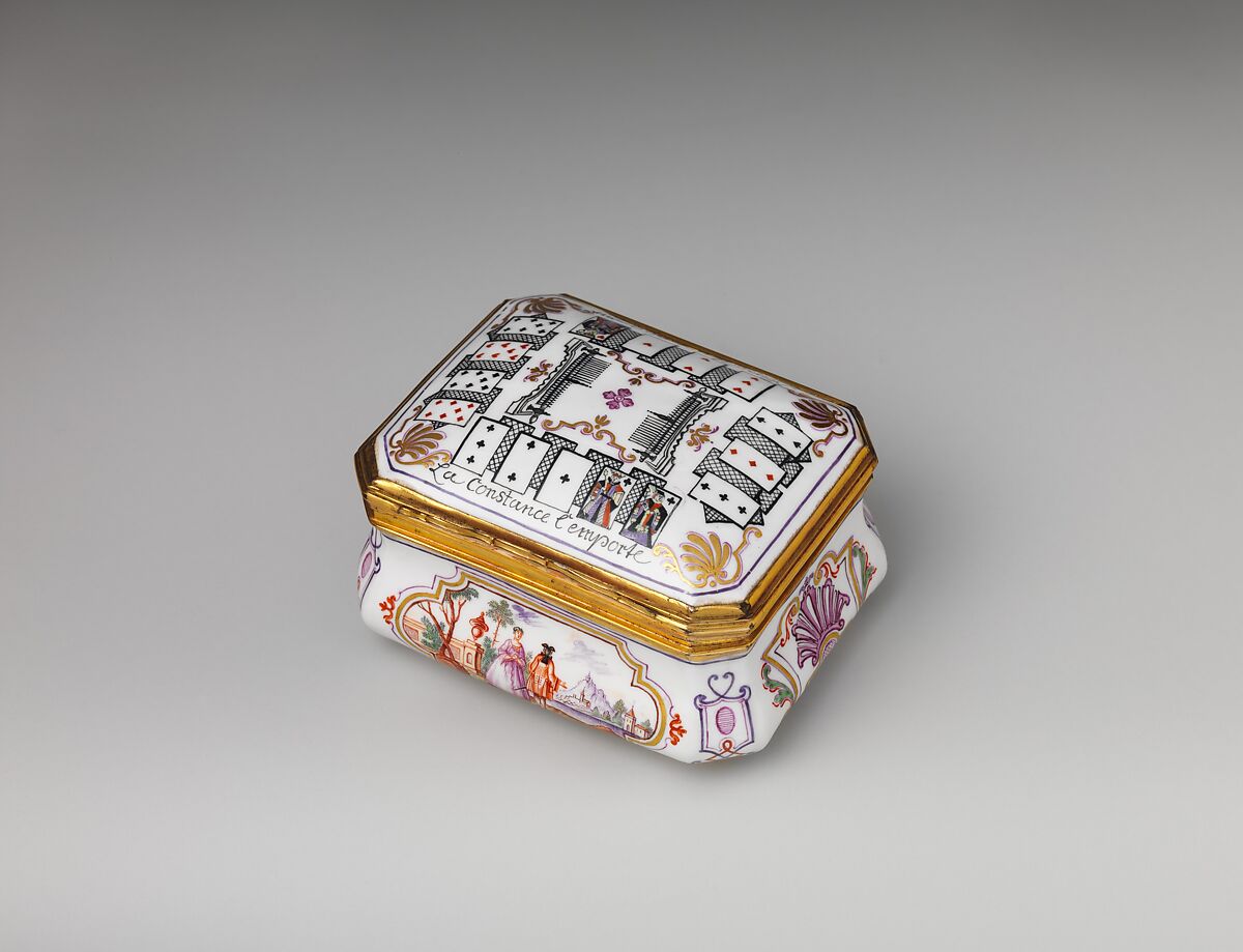 The complex decorative schemes on this box, including four hands of playing cards on the lid, a game of chess in progress on the underside, and three enigmatic inscriptions, suggest that it was commissioned as an intimate gift and expresses a coded message that cannot be easily deciphered today.