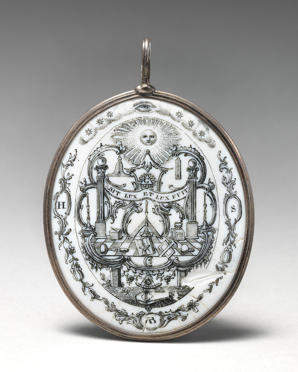 Decorated with a variety of Masonic symbols and phrases, the inclusion of the Latin motto "Amor Honor et Justitia" (Love, Honor, and Justice) on the reverse suggests that this pendant was made for a member of the Grand Lodge of England. 5758, inscribed on a coffin near the lower edge of the obverse, identifies the date (1758) in the Masonic ‘Anno Lucis’ dating system.
