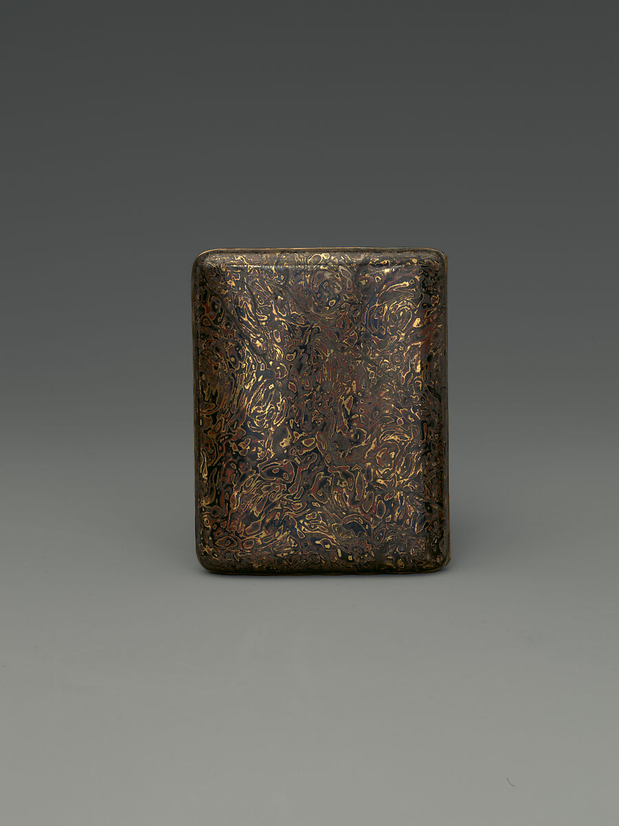 This cigarette case and a related match case (41.140.3) are rare surviving examples of Tiffany & Co.’s laminated metalwork. The marbled surfaces show Tiffany's mastery of the Japanese metalworking technique mokume-gane (meaning "wood grain" or, literally, "wood eye"). The silversmiths at Tiffany experimented tirelessly until they discovered their own method of creating the laminated material, an achievement that had eluded Western metalsmiths. Their process involved layering, soldering, and compressing sheets of metals and alloys together, then manipulating the result by drilling, hammering, and rolling. Initially employed as an accent, the swirling laminate was soon being used to create entire objects, like this one. A surviving technical manual records that staff treated the surface with muriatic acid to impart the polished, glassy finish.