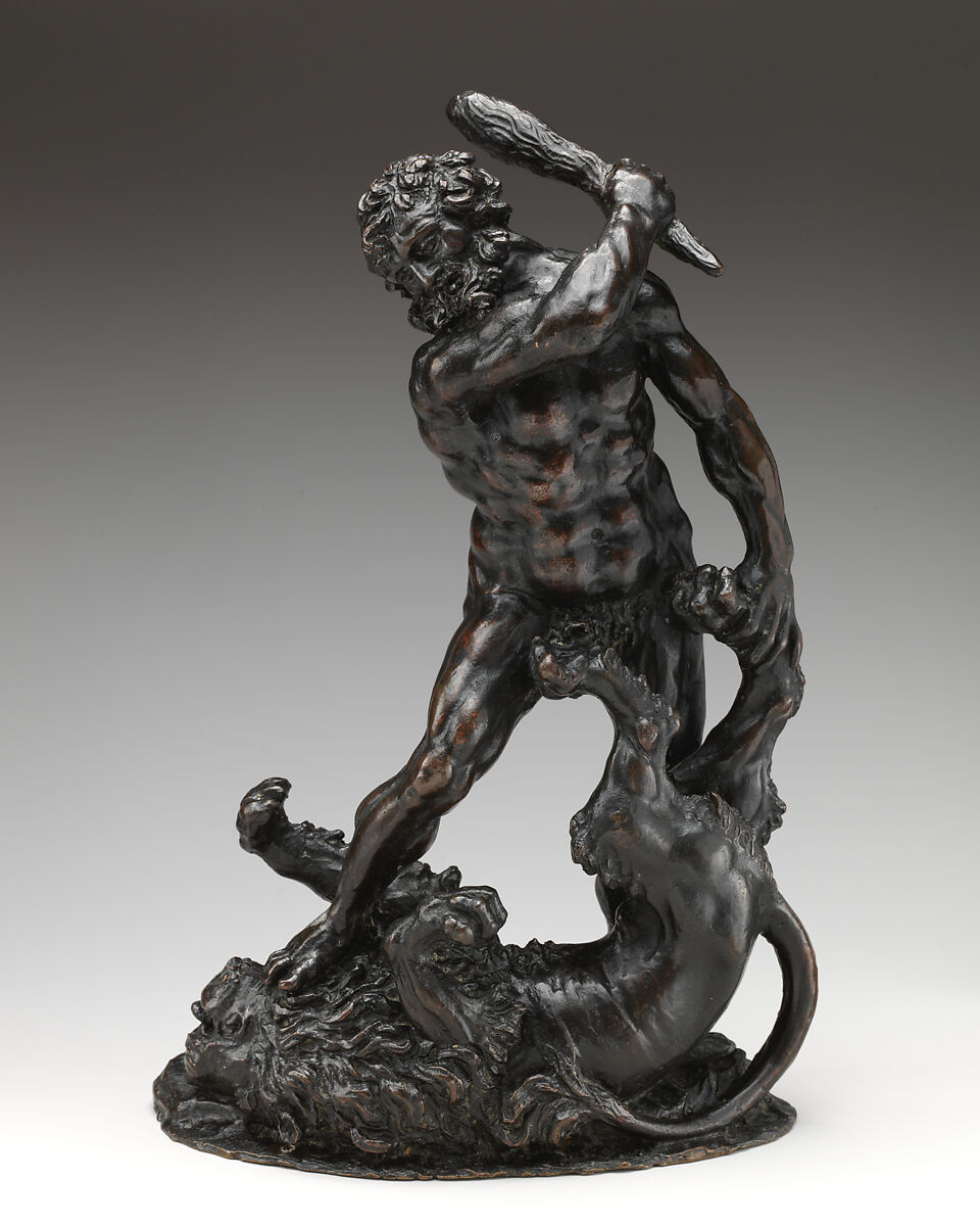 The composition recurs in a bronze in the Badisches Landesmuseum, Karlsruhe, and in another bronze on the art market in London (sale, Sotheby’s, New York, May 29, 1981, no. 162). Wilhelm von Bode discussed the present statuette as an early-sixteenth century Venetian work from the circle of Camelio. However, the violent sideward torsion and the decorous penetrations of space along the right flank are fully Baroque. Convincing comparisons with Italian sculpture are wanting. The richly faceted surface suggests an original model in limewood. The anatomy is expressive but scientifically inexact, as can be appreciated especially in Hercules; muscular back, where the forms are knotted together around a high, pinched-in waist. These qualities recall German Baroque carving—large-scale sculptures by Bendl, Brokoff, and Braun families of Bohemia come to mind—but next to nothing is known about German bronze statuettes of the late seventeenth century.