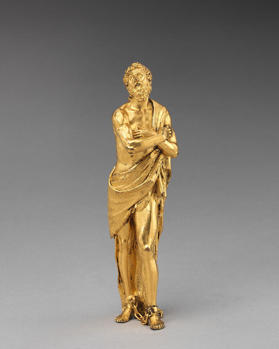 This elongated and refined statuette represents a bearded prisoner. He gazes imploringly to the heavens, arms hugging chest, trudging wearily forward, ankles bound in separately cast chains. The shining surface was later gilded. Emphasizing the figure’s elegant contrapposto, James David Draper assigned it to an artist working in the stylistic wake of Guglielmo della Porta, premier master of bronze sculpture in sixteenth-century Rome. Draper identified the subject as Saint John the Baptist in chains, but Nicolas Penny recognized the bronze as one of a series of male and female prisoners in the Ashmolean and the V&A. The Ashmolean has two bronzes—a haggard male and female in distress, the male identical to ours—that come from the Fortnum collection, where they were catalogued as “16th/17th century, probably Florentine.”[1] The V&A has four silver statuettes: two males—one identical to our prisoner, the other a barely clad youth (figs. 181a–b)—and two desperate, partially naked females.[2] The four probably constitute the complete set, and they are evidently meant to be paired: two younger prisoners and two older ones.