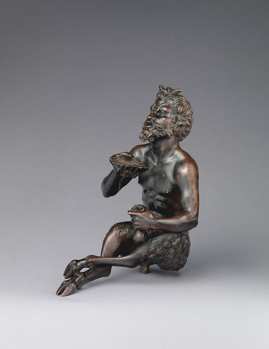The object in the satyr’s left hand, possibly s moneybag, is of later facture. Otherwise, the bronze is unusually crisply chased and an altogether superior product of the Riccio workshop. Its details, especially the hair, are more incisive than those of the seated satyr with inkwell, shell, and candlestick in the Frick Collection, New York, which bears the arms of the Paduan Capodivacca family, and much more so than related bronzes in Berlin-Dahlem and in the Louvre. A good variant was in the Chichester-Constable collection. Although the alert poses greatly resemble each other, notably in the gracile grossing of the hooves, it is worth stressing that the composition of each member of this group was completely reworked, as was standard practice in the Riccio workshop.