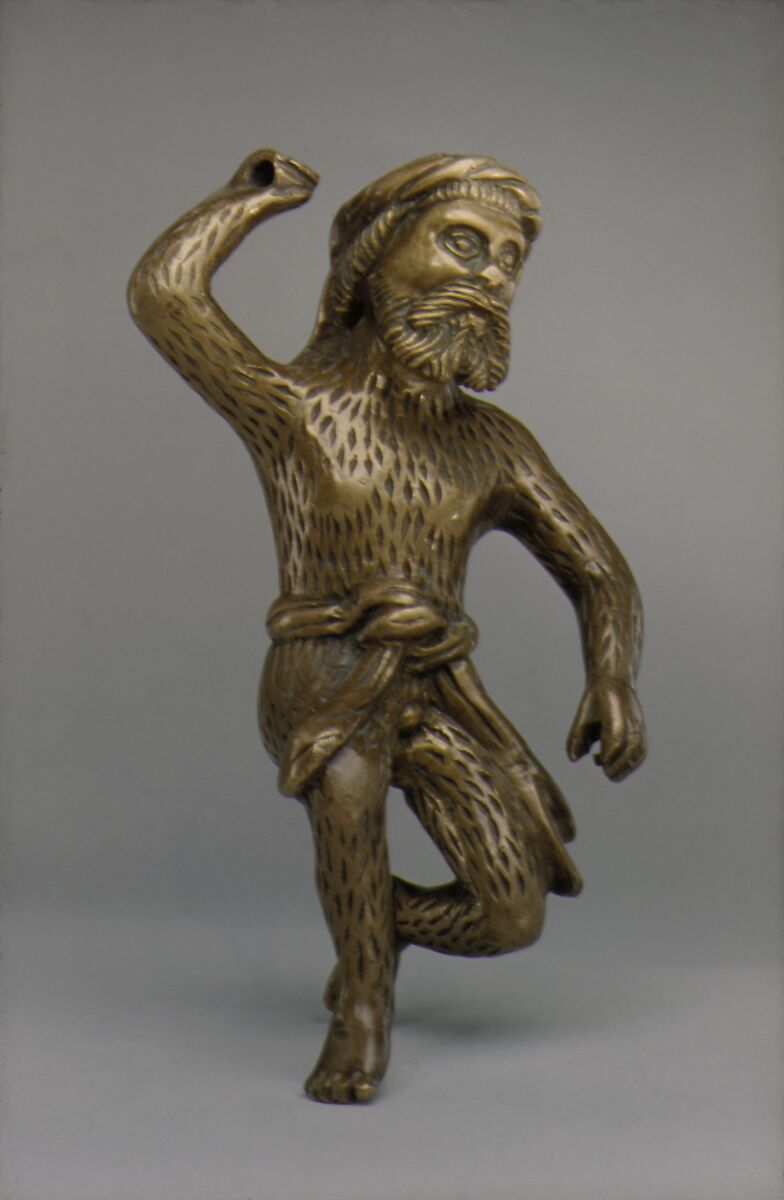 This statuette was included, hors catalogue, in the 1980 exhibition at The Cloisters, “The Wild Man: Medieval Myth and Symbolism.”[1] The hirsute species survived well into the sixteenth century, notably in the imagery of Albrecht Dürer, but in an increasingly heraldic role. Our example no doubt brandished a club in his raised right hand and with his lowered left (where there are remains of a pin) steadied a shield, as did the Wild Men that functioned as supporting figures or finials on various earlier utensils.[2] He might have served as either a support or a finial for an object such as a large tankard; wide holes in his seat and in the top of his head indicate that the place of attachment could have been at either end. The Linsky Wild Man illustrates the fundamental conservatism of dinanderie as it survived into the sixteenth century, the only novelty being the diamond-shaped gouges that characterize his hairy hide.