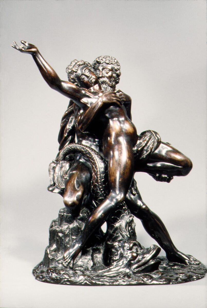 The composition is derived from an engraving, dated 1580, by Johann Sadeler the Elder, based in turn on a drawing by Bartholomaeus Spranger in the Museum Plantin-Moretus, Antwerp. The crisscrossing forms realized in the bronze were a quintessential feature of Spranger's brand of Mannerism. Born in Antwerp in 1546, Spranger traveled widely in Italy and worked for Maximilian II and Rudolph II in Vienna and in Prague, where he died in 1611. A later cast of this bronze, in which the figure of Caenis is more modestly draped and the rhythms of the waves are more repetitious, has been attributed to Hans Mont, a sculptor from Ghent who is known to have collaborated with both Giovanni Bologna and Spranger, but Mont's actual style is an unknown quantity.