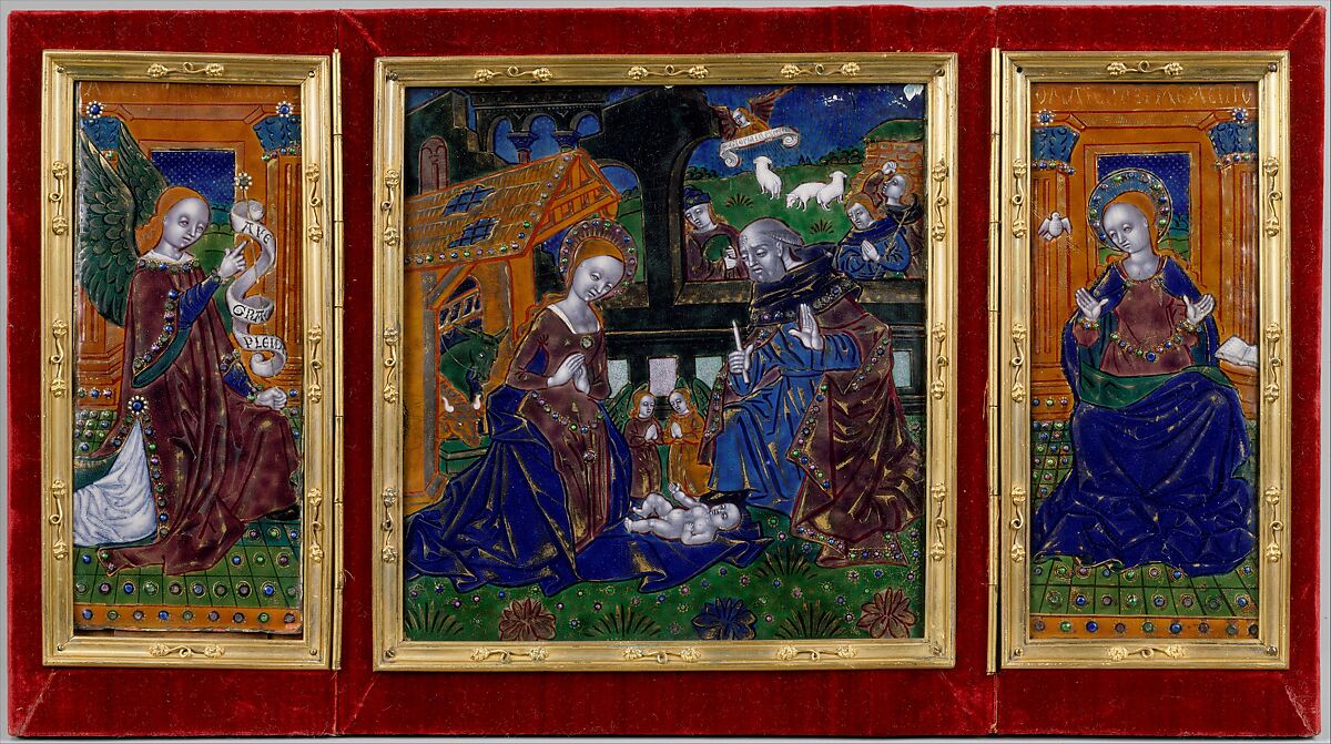 Comparison of this triptych with the work of an early Renaissance French enamel painter known as the Master of the Orléans Triptych, whose artistic identity was first recognized in an enamel triptych depicting the Annunciation in the collection of the Musée HIstorique et Archéologique de l'Orléanais, Orléans, shows that the anonymous painter of the Metropolitan's acquisition tended to repeat the master's compositions, but with the kinds of generalized form and abbreviated detail that are usually associated with workshop production.