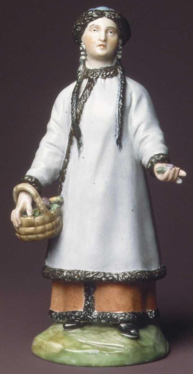 About 1780 the Imperial factory began the production of a large series of figures depicting Russian national types, of which fourteen are represented in the Linsky Collection. Like most of the figures, this figure is modeled from engravings published by Johann Gottlieb Georghi in his Description if All the Peoples Inhabiting the Russian State (editions of 1774, 1776, and later). The authorship of the models themselves is not established, but some may be attributable to Jean-Dominique Rachette (1744–1809), chief modeler at the factory from 1779 to 1804.