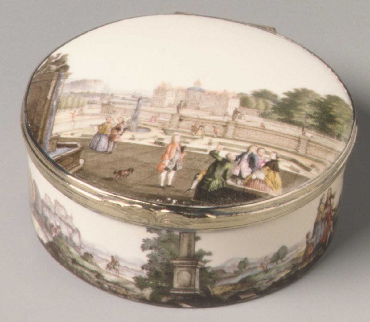 Both sides of the cover, the walls, and the base are painted with views of châteaus and of an extensive riverscape.