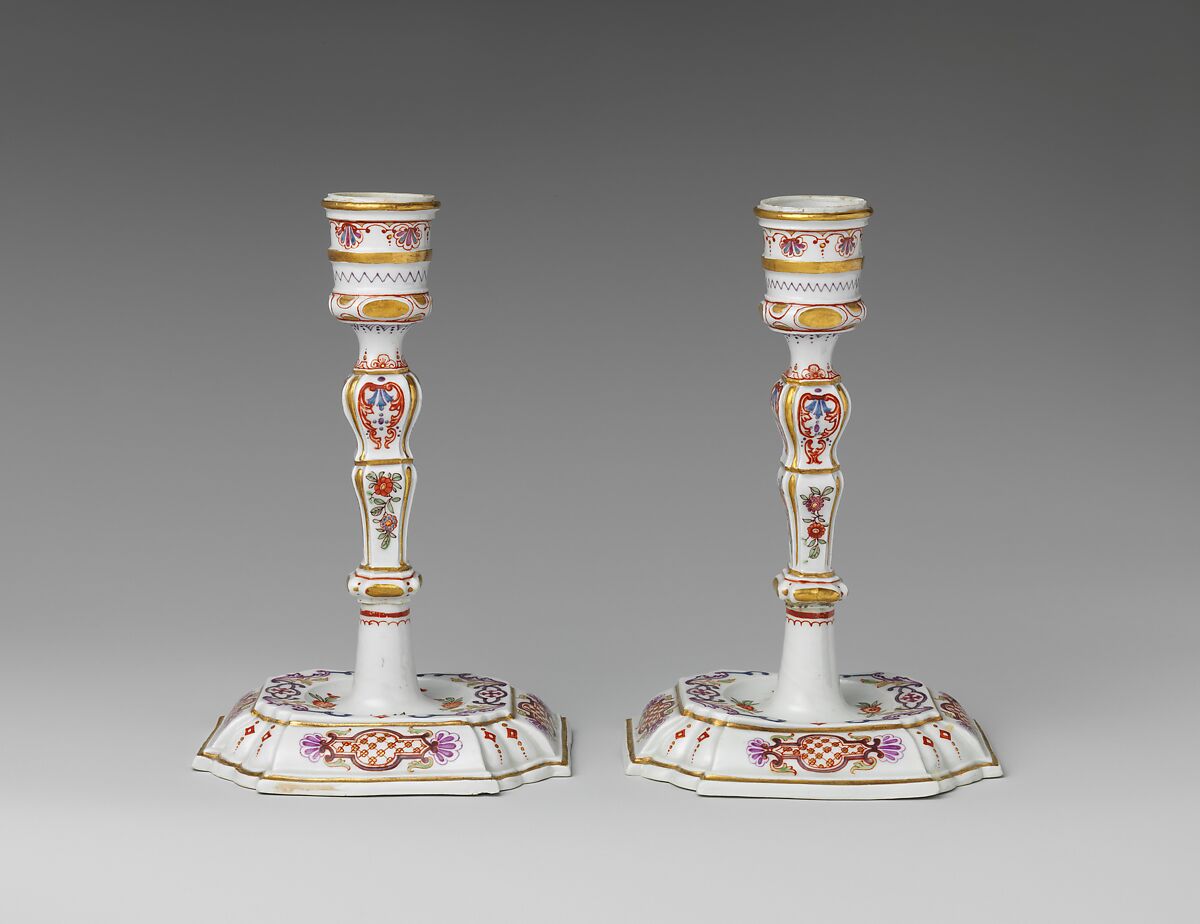The design of these candlesticks, with a baluster-shaped stem rising from a low domed base, was one of the most common in earlyeighteenth-century Europe and was taken from examples in silver. It is unclear whether the two candlesticks were made as part of a table or toilet service or to accompany a desk set. Few porcelain candlesticks survive, largely because of the fragility of the medium.