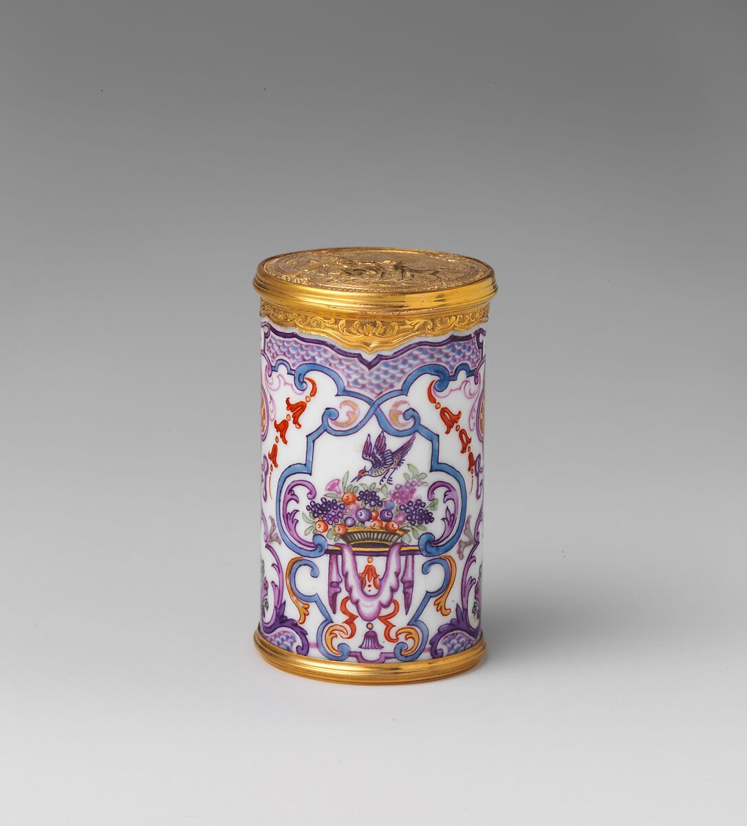 This box held circular gaming pieces known as counters. Its lavish decoration extends not only to the top and bottom but also to the underside of the lid and the inside of the base, ensuring the delight of discovery when the last counter was removed. The rich decoration is enhanced by the superb gold mounts, and the correspondence between the upper mount’s profile and the scale pattern painted
