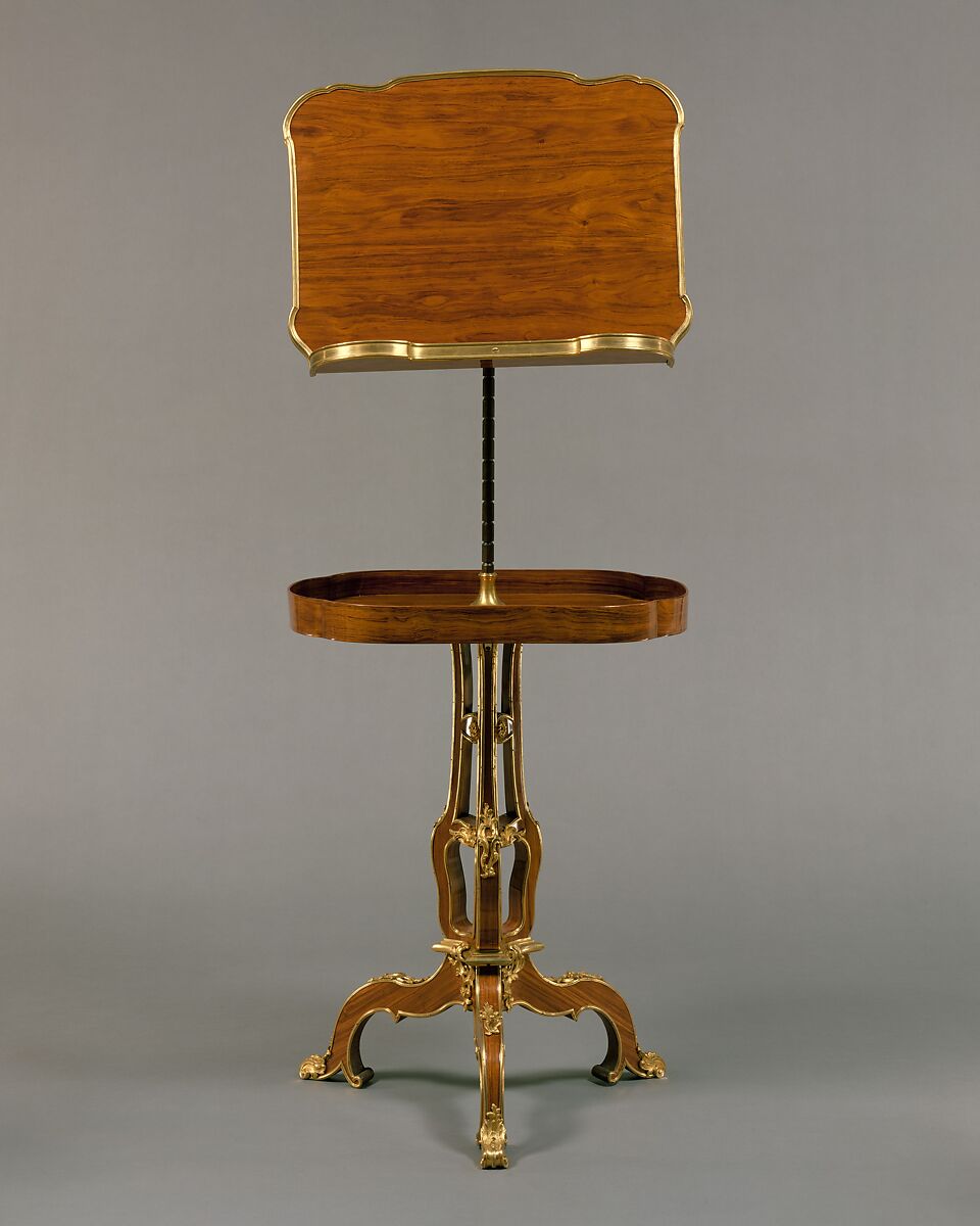 Though without a signature, this piece has been attributed to the ébéniste Martin Carlin, who was permitted to sign workshop products only after his election as master cabinetmaker in 1766. The distribution of gilt-bronze ornament over the base is reminiscent of the dispositions of mounts that appear on later tripod stands, signed by him, in the Louis XVI style. Carlin may have produced the Museum's reading stand in the early 1760s while working under the influence of his brilliantly inventive brother-in-law, Jean-François Oeben, a practicing cabinetmaker from 1754 until his death in 1763.
