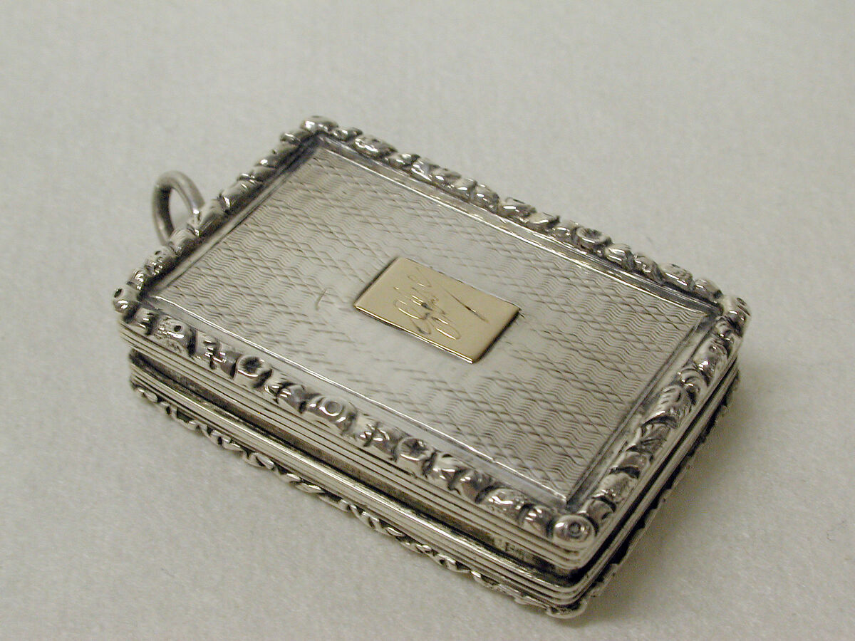 This rectangular vinaigrette has an applied foliate border; the base and lid are decorated with basket-weave engine turning. The name "Else" is engraved on a gold plaque applied to the lid. The ring, attached at one end, allowed the vinaigrette to be worn around the neck or attached to a chatelaine suspended from the waist; the hinged interior grille has pierced foliate decoration.