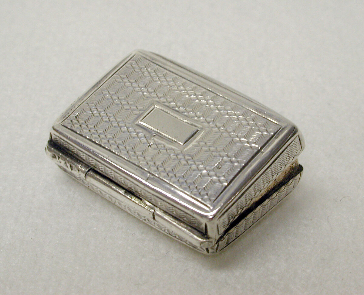 A vinaigrette was intended to hold a tiny sponge dipped in aromatic vinegar. Its interior Is gilded to protect the silver from oxidation caused by the acidity of the vinegar. A hinged and decoratively pierced inner lid or grille, here formed of foliate scrolls, kept the sponge in place while its perforations allowed the odor to waft through. A whiff of the vinegar might revive someone from a fainting spell. Such vinaigrettes were worn around the neck, on a chatelaine suspended from the waist, or carried in a pocket.