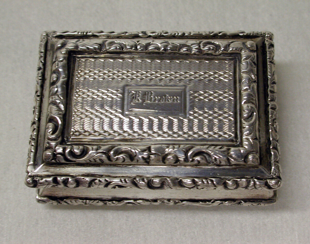 Nathaniel Mills, considered one of the finest boxmakers of Birmingham and certainly the most prolific, used flower, foliate and scrollwork surrounds for card cases, boxes (14.58.210) and vinaigrettes as seen here and 1983.575.40.