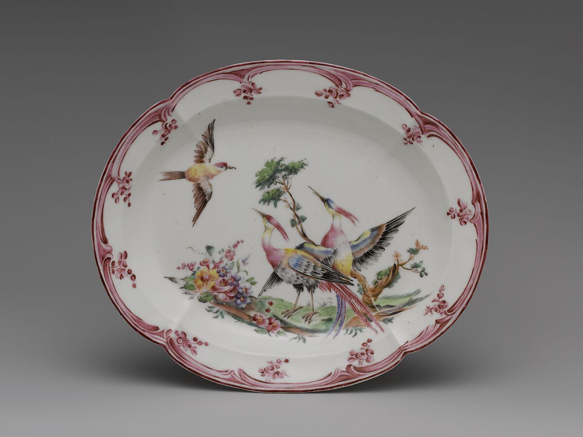 However, the choice by the workers at the Mennecy factory to employ purple enamel for the border was determined less by aesthetic considerations than by political and commercial ones. In 1745 a royal privilege had been granted to the Vincennes factory, recently established in the medieval Château de Vincennes to the southeast of Paris, which gave the young enterprise the exclusive right in France to use gilding in the decoration of porcelain. The wording of the privilege, which is slightly ambiguous,[14] also permitted Vincennes to be the sole French porcelain factory to include the human figure in its decorative schemes. The purple border on the Mennecy stand, and perhaps even the choice of birds for the central composition, reflects the factory’s creative response to the restrictions imposed by the privilege awarded to Vincennes.