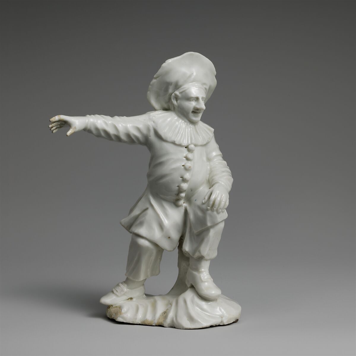 The figure is based on a print by Johann Esaias Nilson (1721–1788) that was published about 1767. In the original, Pedrolino is depicted as a child, a member of a traveling childrens' troupe. The modeler of this figure has substituted the face of an adult actor.